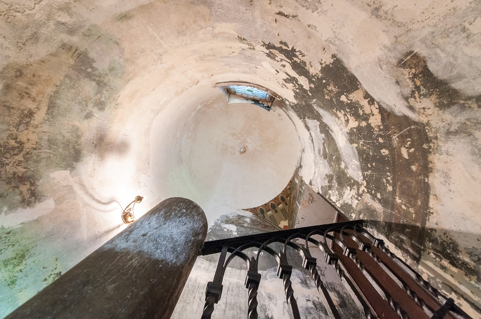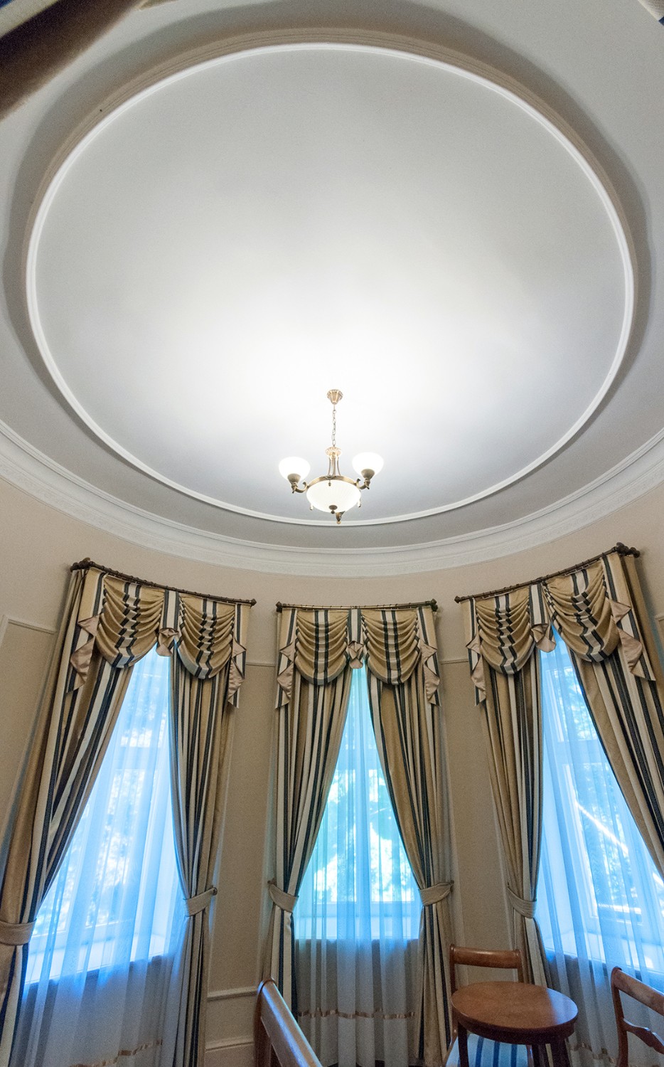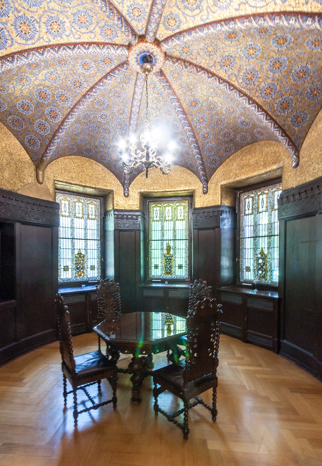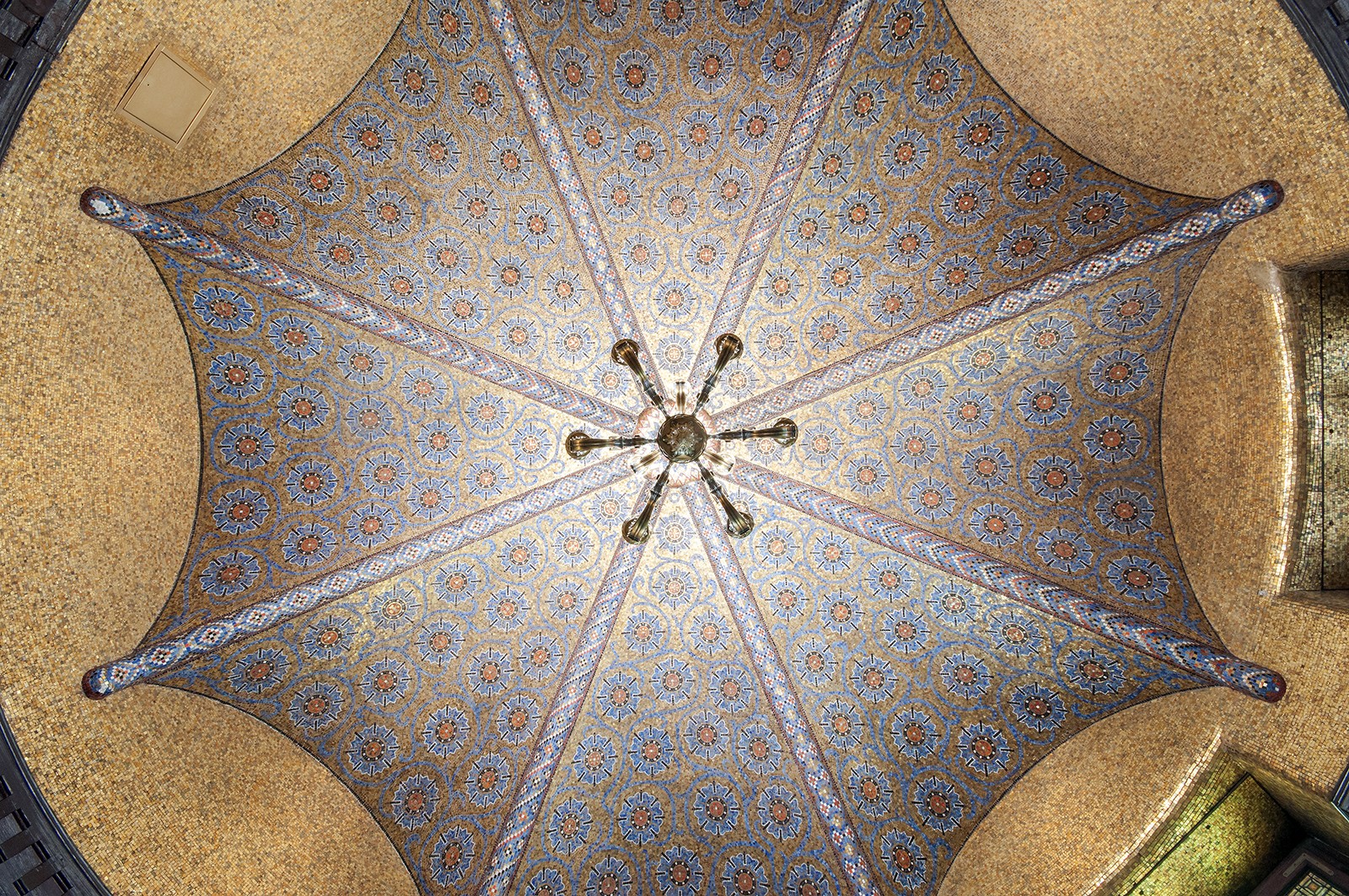 • Kuplesal i østtårnet med geometriske loftmalerier og farvede glasvinduer