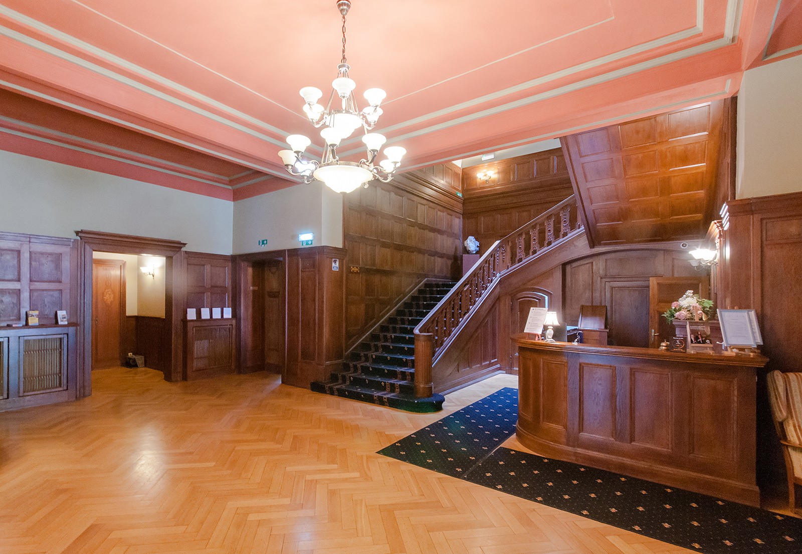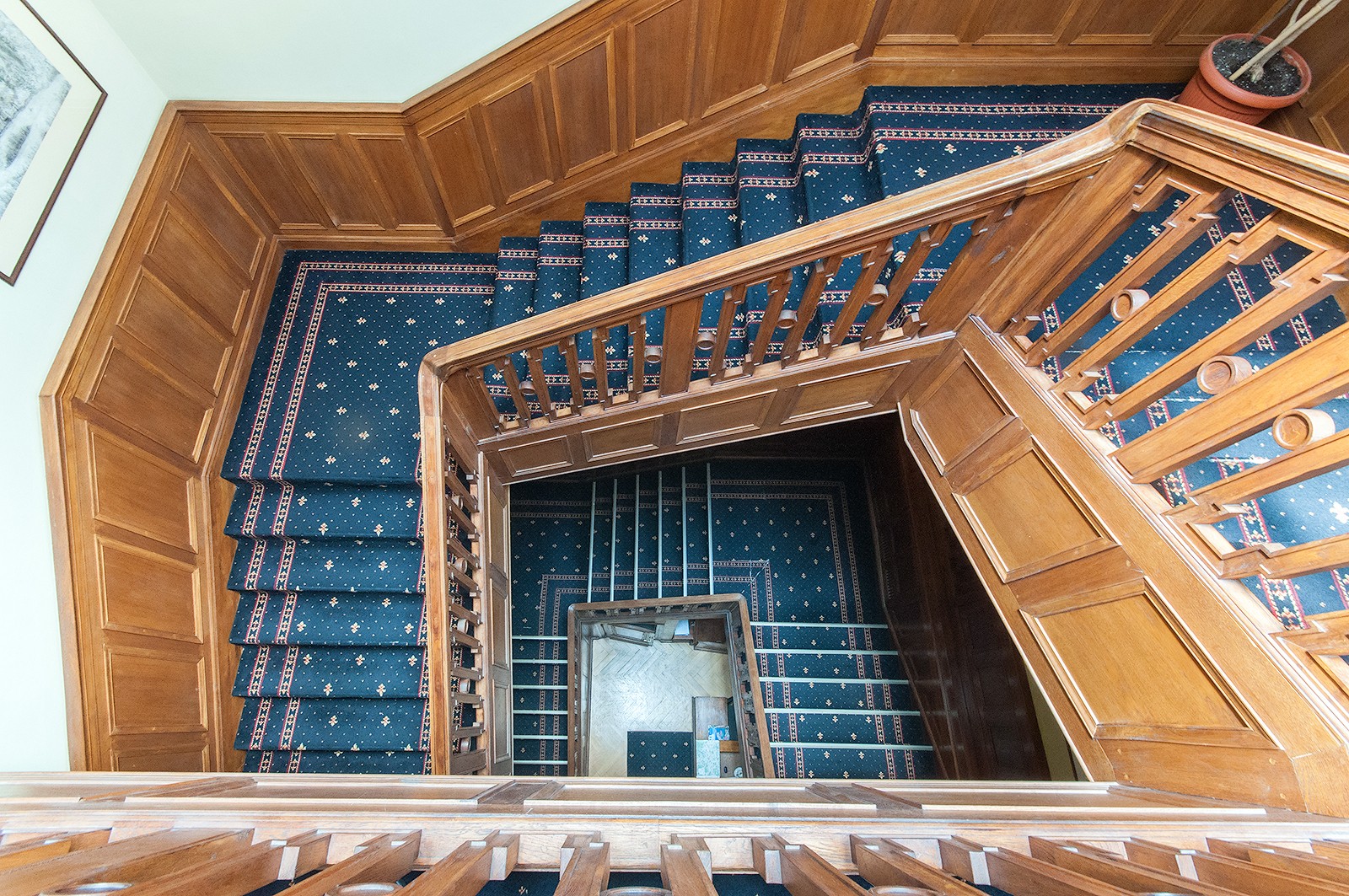 • Indgangshall med repræsentativ egetræstrappe, kunstfærdig balustrade og detaljerede træarbejder