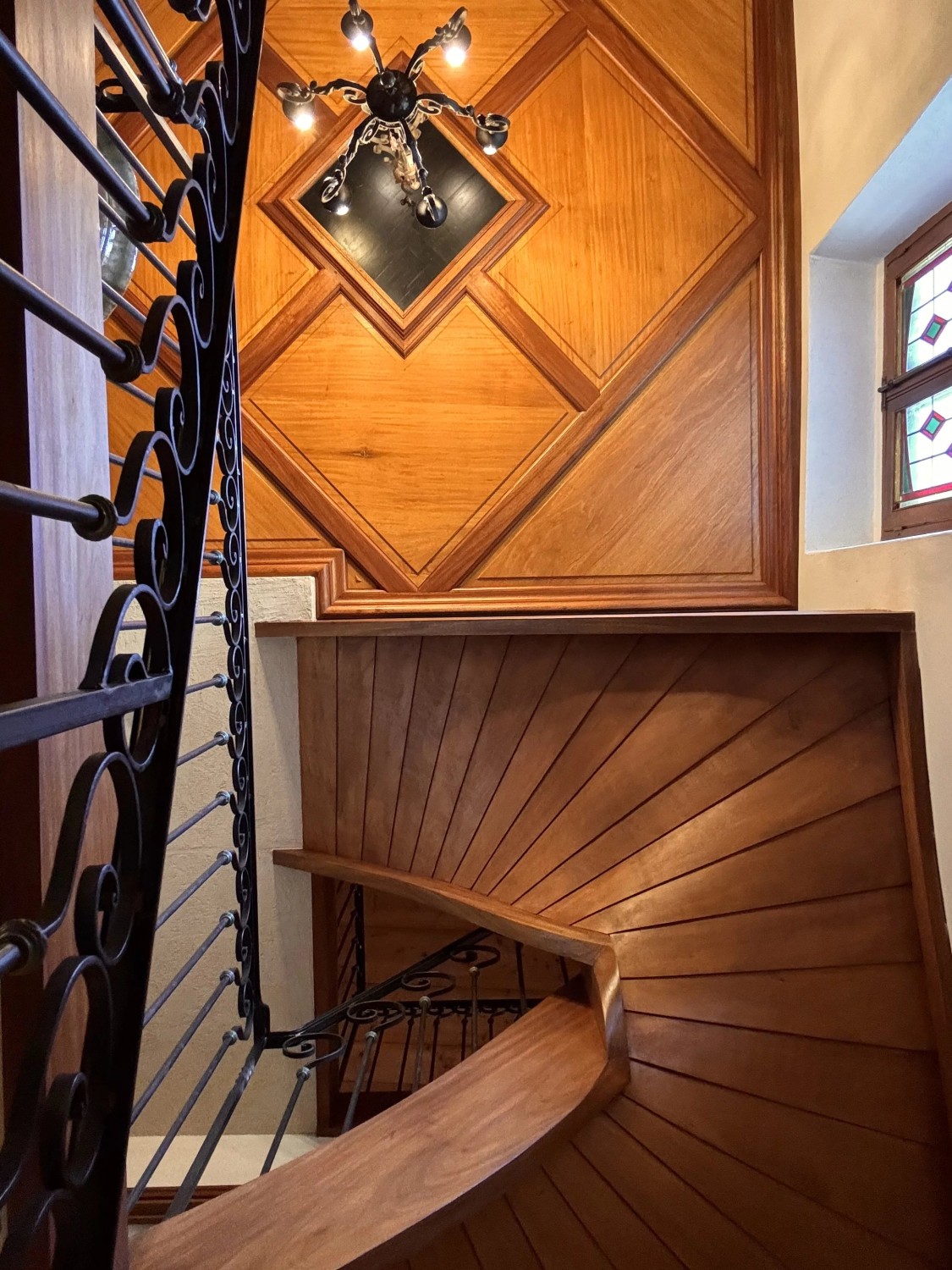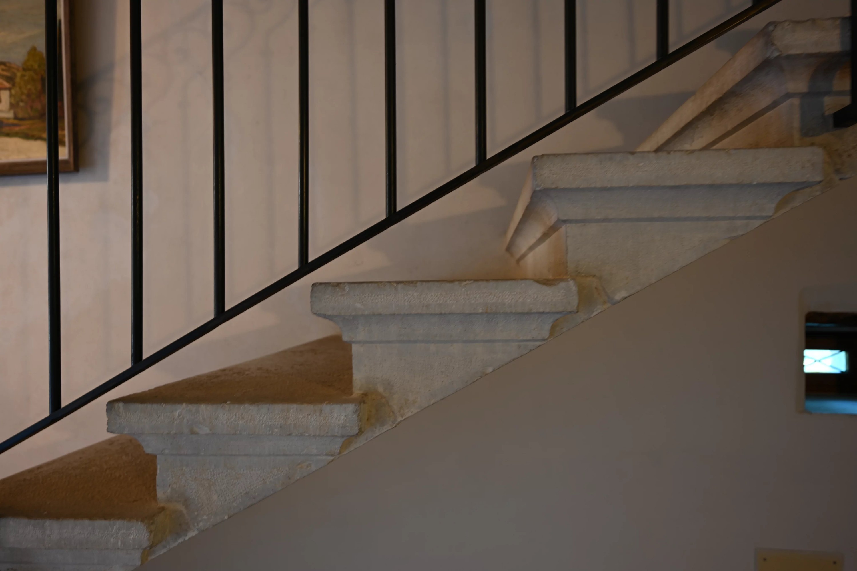 Fra indgangen fører en stentrappe med smedet gelænder til de øvre etager, hvor der findes tre suiter, heraf én med arbejdsværelse og boudoir.