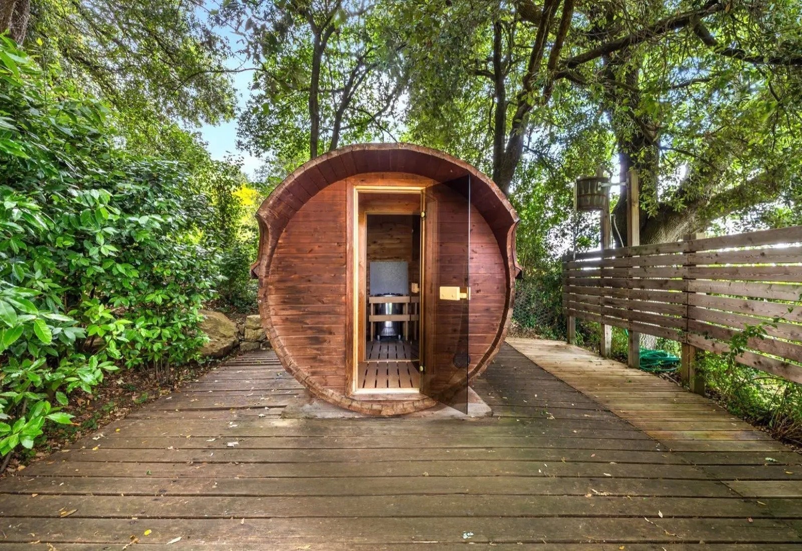 De ca. 1,5 hektar er omhyggeligt anlagt. Terrasserede haver leder til et panoramabassin med solterrasse, jacuzzi og afslapningsområder. Der er også finsk sauna og fitnessrum. Stier fører gennem frugtplantager til privat parkeringsplads og skovhytten. En vinkælder kan bruges til smagninger eller opbevaring.