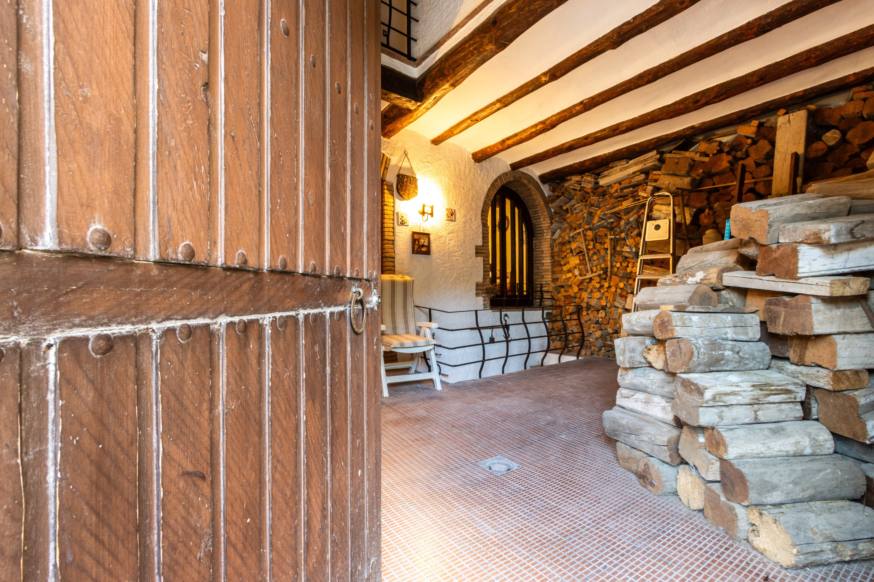 Adgangen til ejendommen sker via en rummelig, stenopført forbygning, som anvendes som overdækket parkeringsplads og opbevaring af brænde. Her findes også bryggerset (5,75 m²), hvorfra der er adgang til boligens opholdsrum.