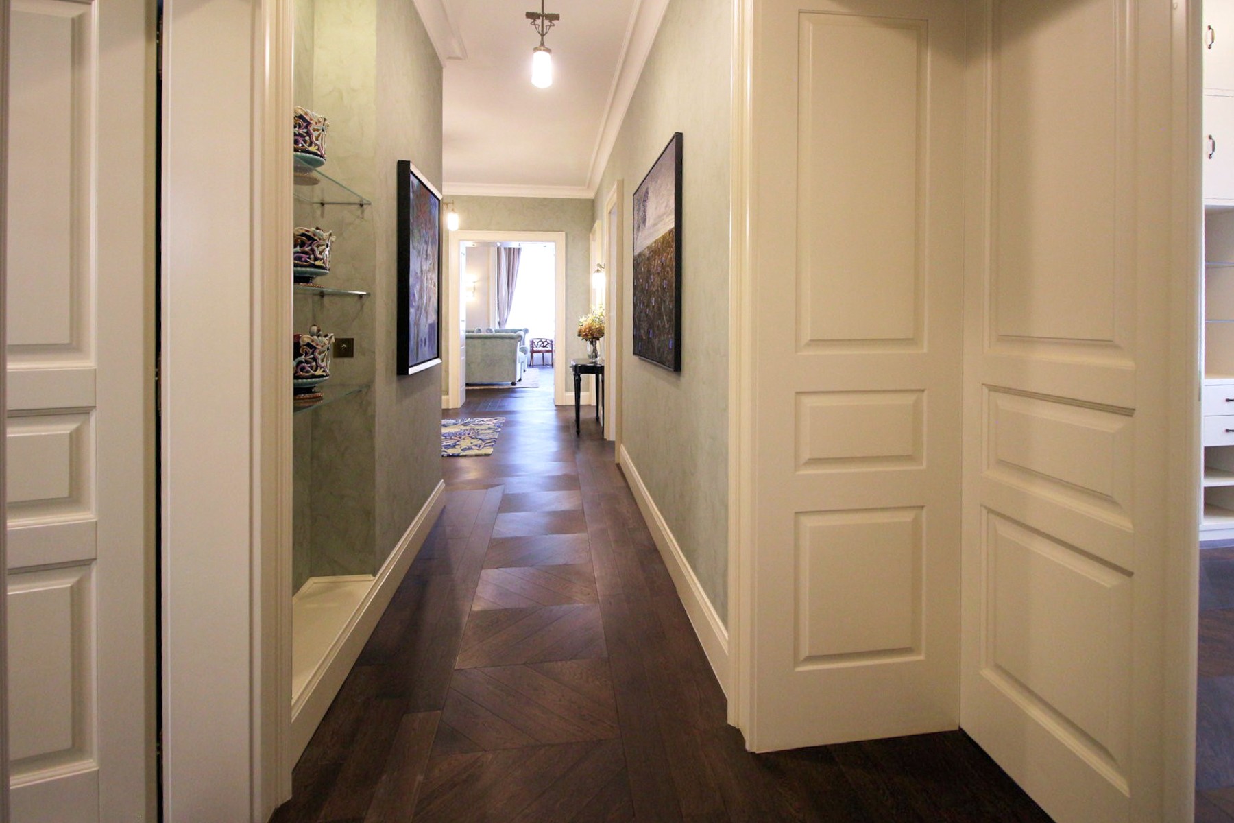 Der Eingangsbereich führt zu den zentralen Räumen: Wohnzimmer mit Kamin, Esszimmer, Küche, Arbeitszimmer und drei weiteren Zimmern – zwei als Schlafzimmer, eines als großes begehbares Ankleidezimmer.