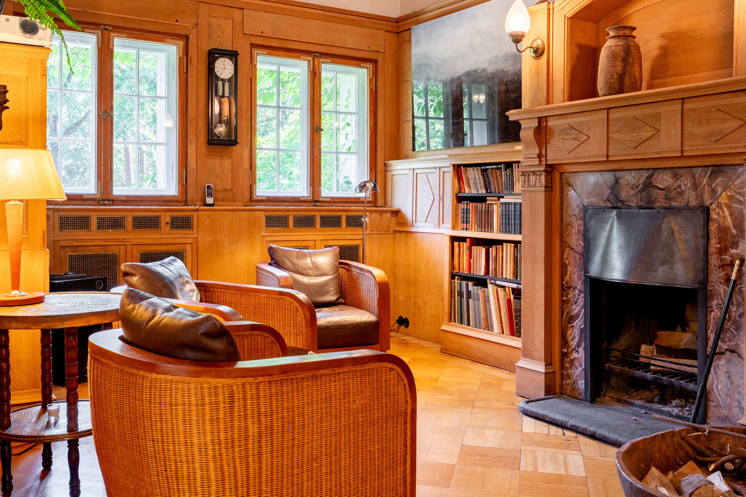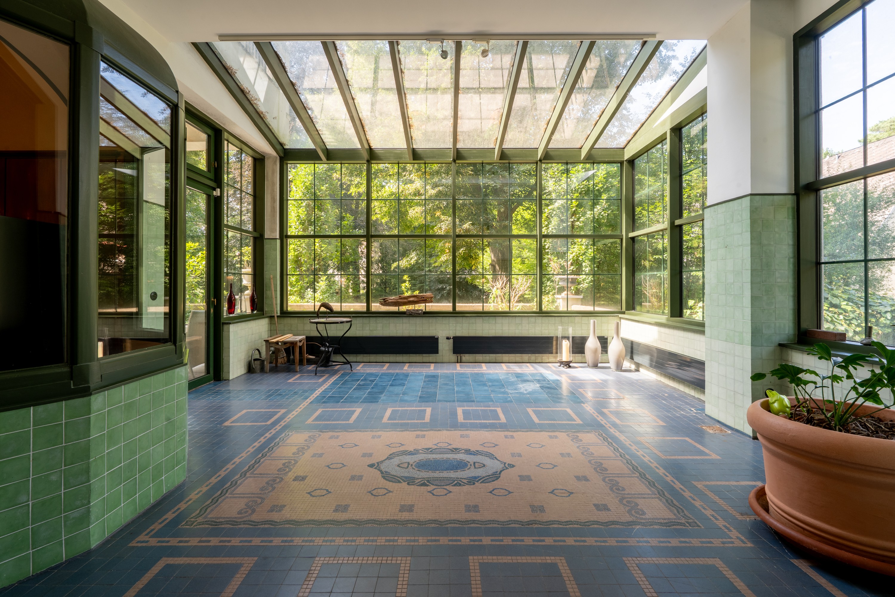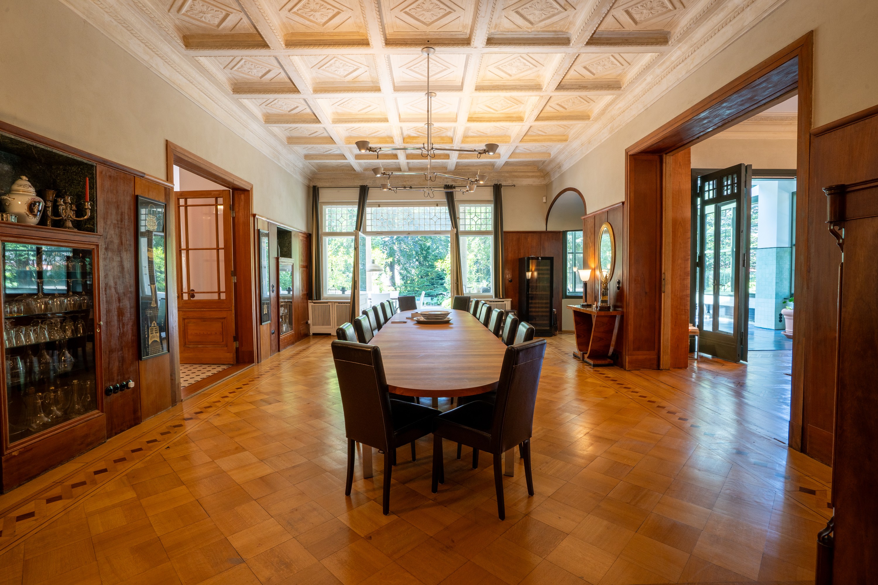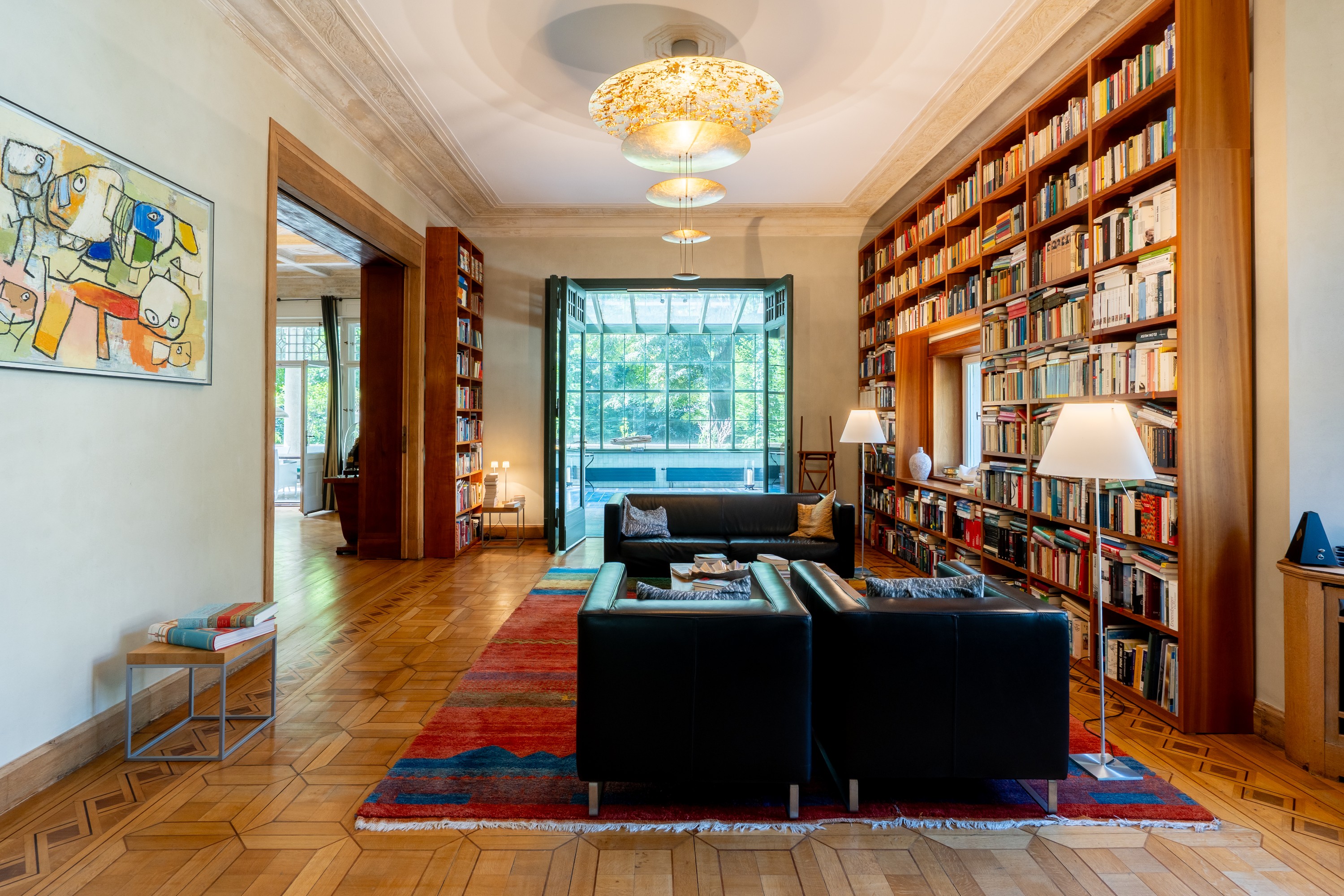 Bereits das Entrée macht deutlich, dass dies kein gewöhnliches Haus ist: eine zweigeschossige Halle mit umlaufender Galerie, kunstvollen Glasmalereien und handgeschnitzten Balustern empfängt Bewohner und Gäste mit festlicher Grandezza. Die Enfilade aus Salon, Bibliothek und Speisesaal öffnet sich mit hohen Flügeltüren zum Garten – Räume, die gleichermaßen für gesellschaftliche Anlässe wie für familiäre Geborgenheit geschaffen scheinen. Originaldetails wie Kassettendecken, Stuckmarmor, historische Parkettböden und ein Wintergarten mit ornamentalem Mosaikboden erzählen von handwerklicher Meisterschaft.