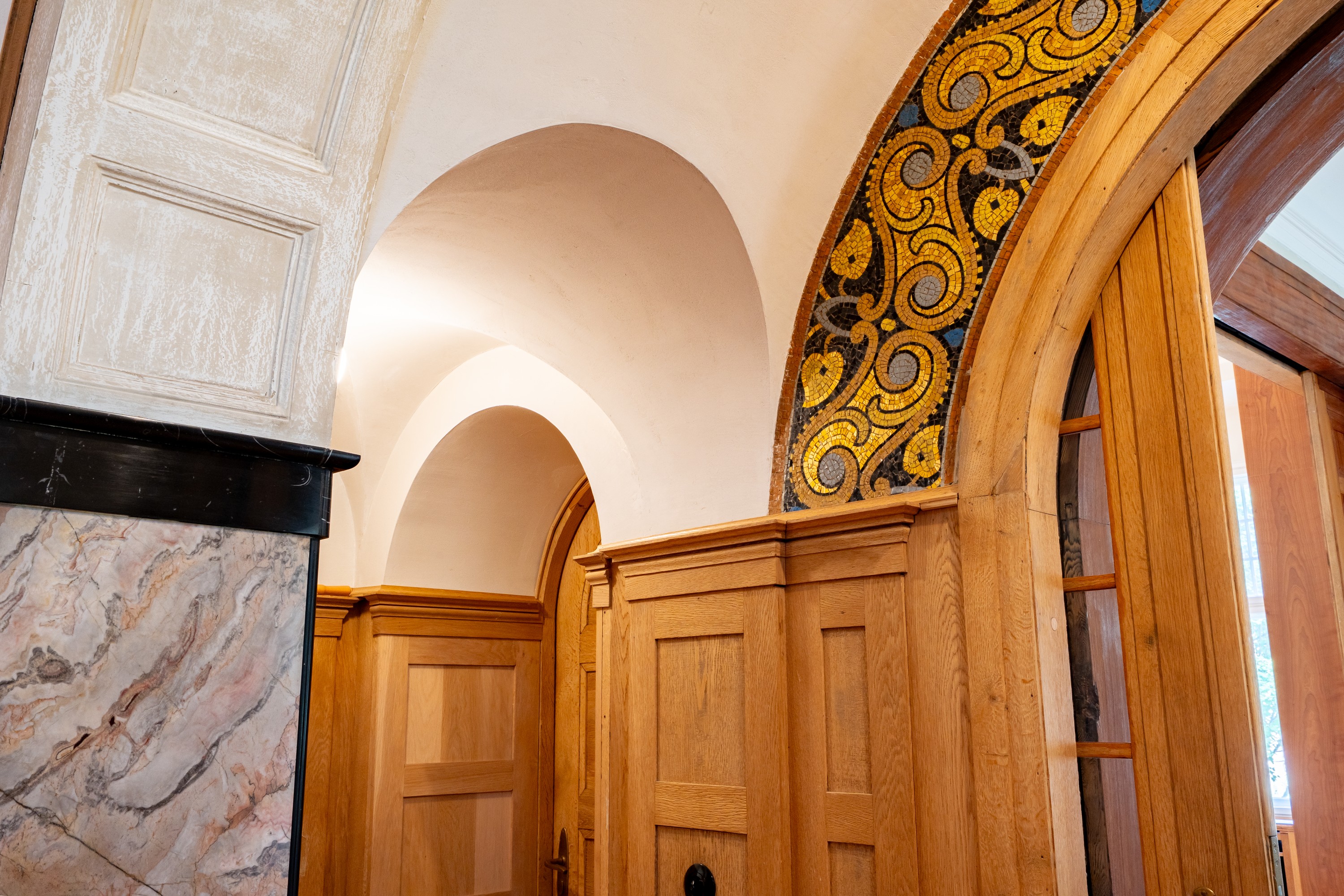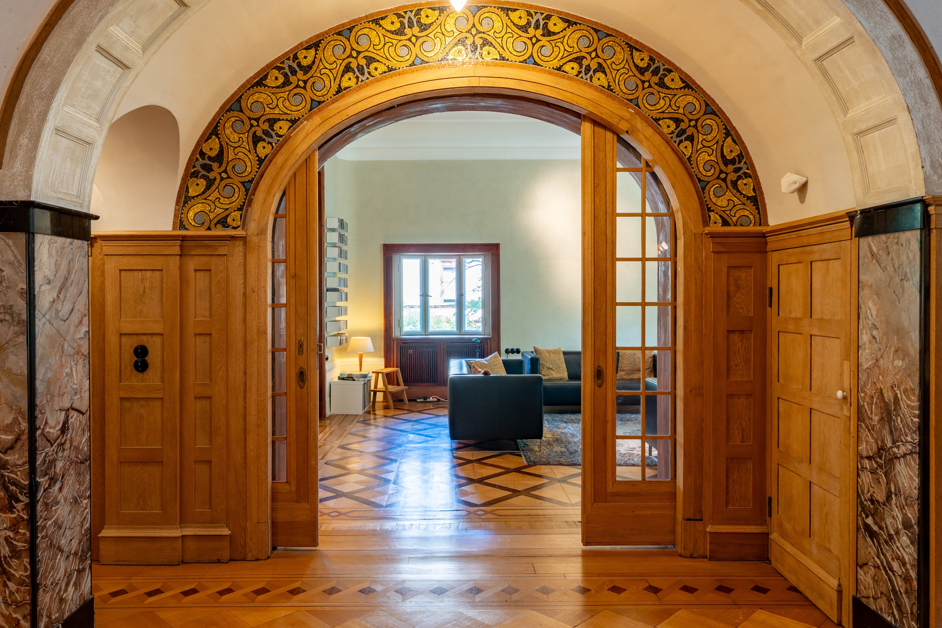 Die repräsentative Landhausvilla wurde von ihren Eigentümern mit großem Respekt vor der Geschichte zu neuem Leben erweckt – eine sanfte, aber aufwendige Restaurierung, die Jugendstilelemente wie Mosaike und kunstvoll gearbeitete Treppengeländer wieder zum Strahlen brachte, während erfahrene Handwerker es verstanden, die historischen Infrastruktur in ein modernes Energiekonzept zu integrieren.