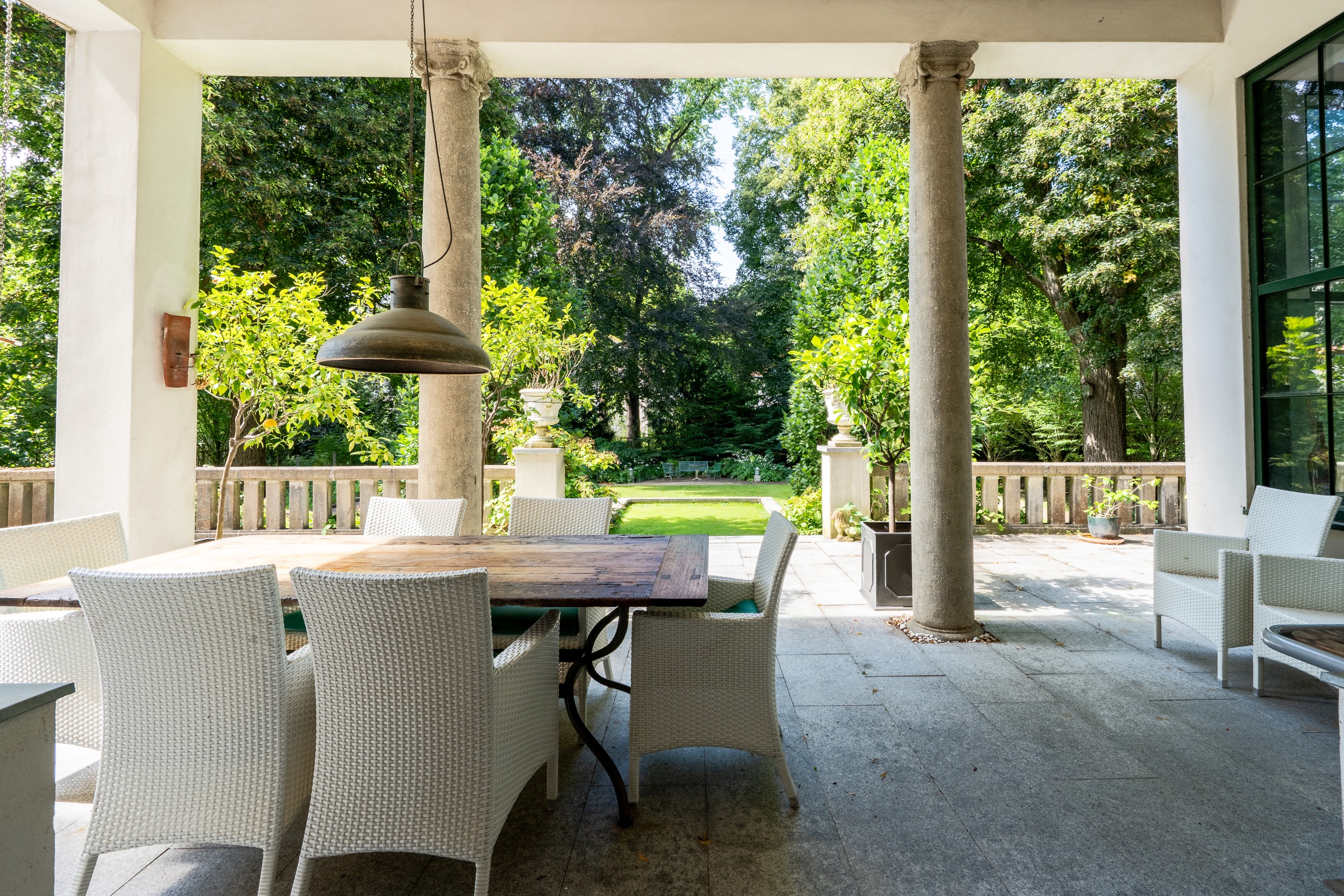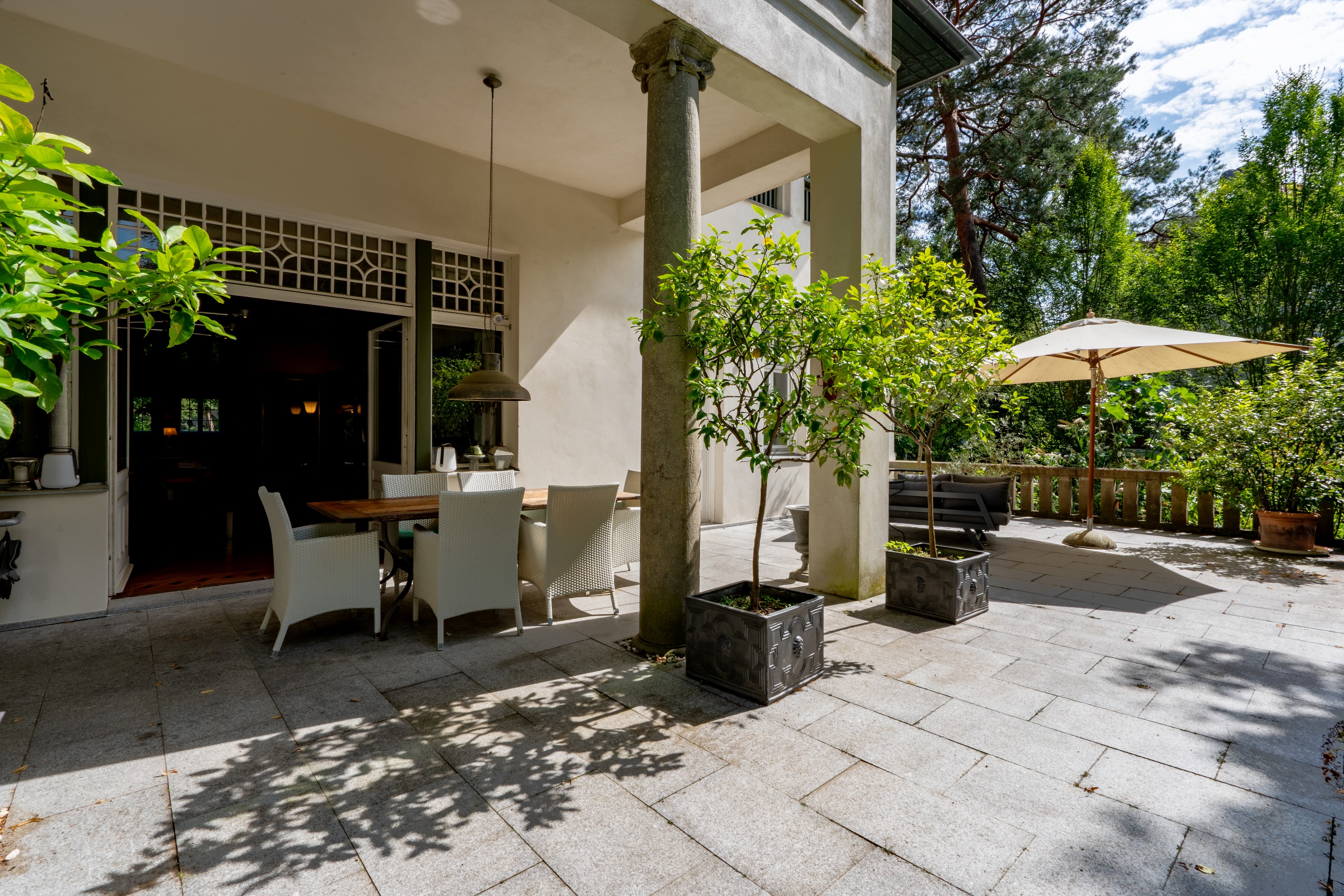 Die Villa wird von einer denkmalgeschützten Gartenanlage gerahmt: Natursteinwege, alte Bäume und ein historischer Wandbrunnen mit Faunenmaske schaffen eine Atmosphäre, die gleichermaßen repräsentativ wie wohltuend still wirkt. Breite Terrassen, ein Altan sowie mehrere Loggien und Balkone verbinden Haus und Natur auf harmonische Weise.