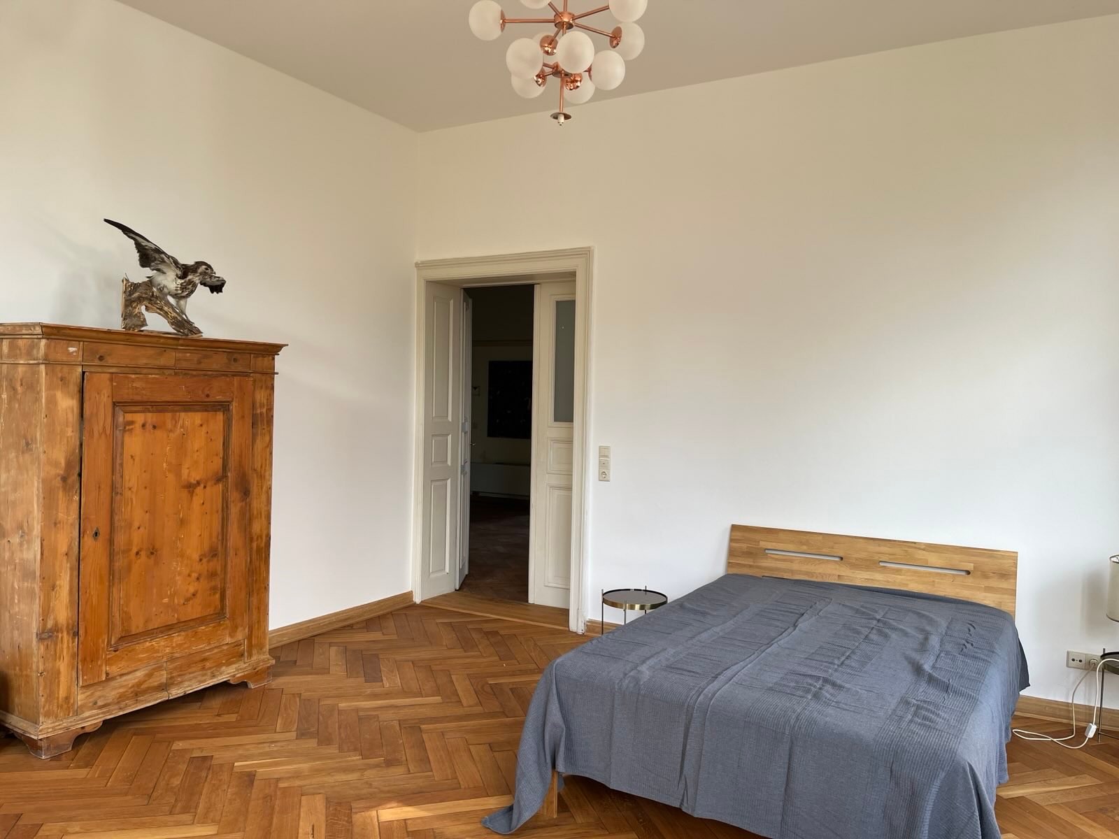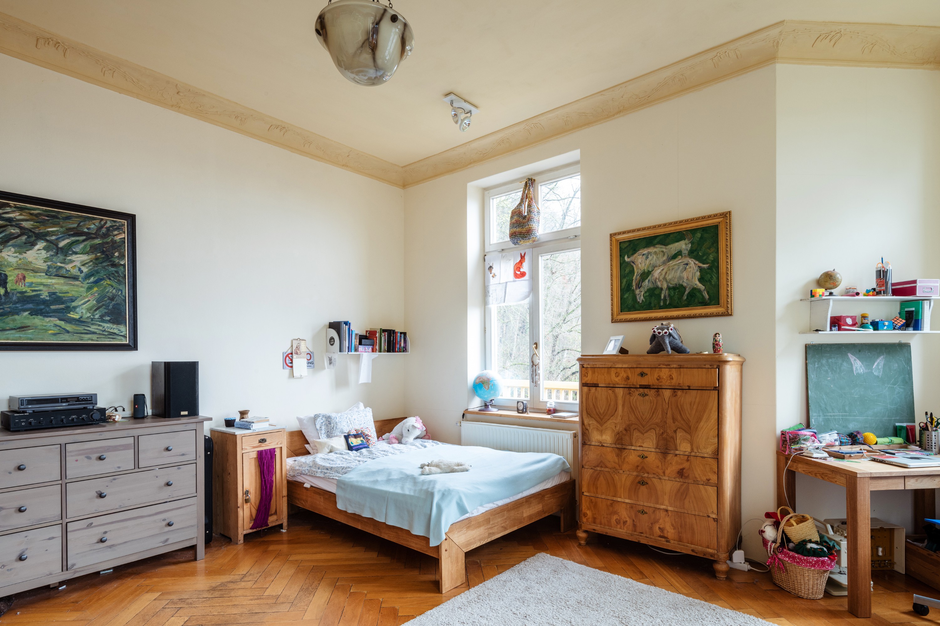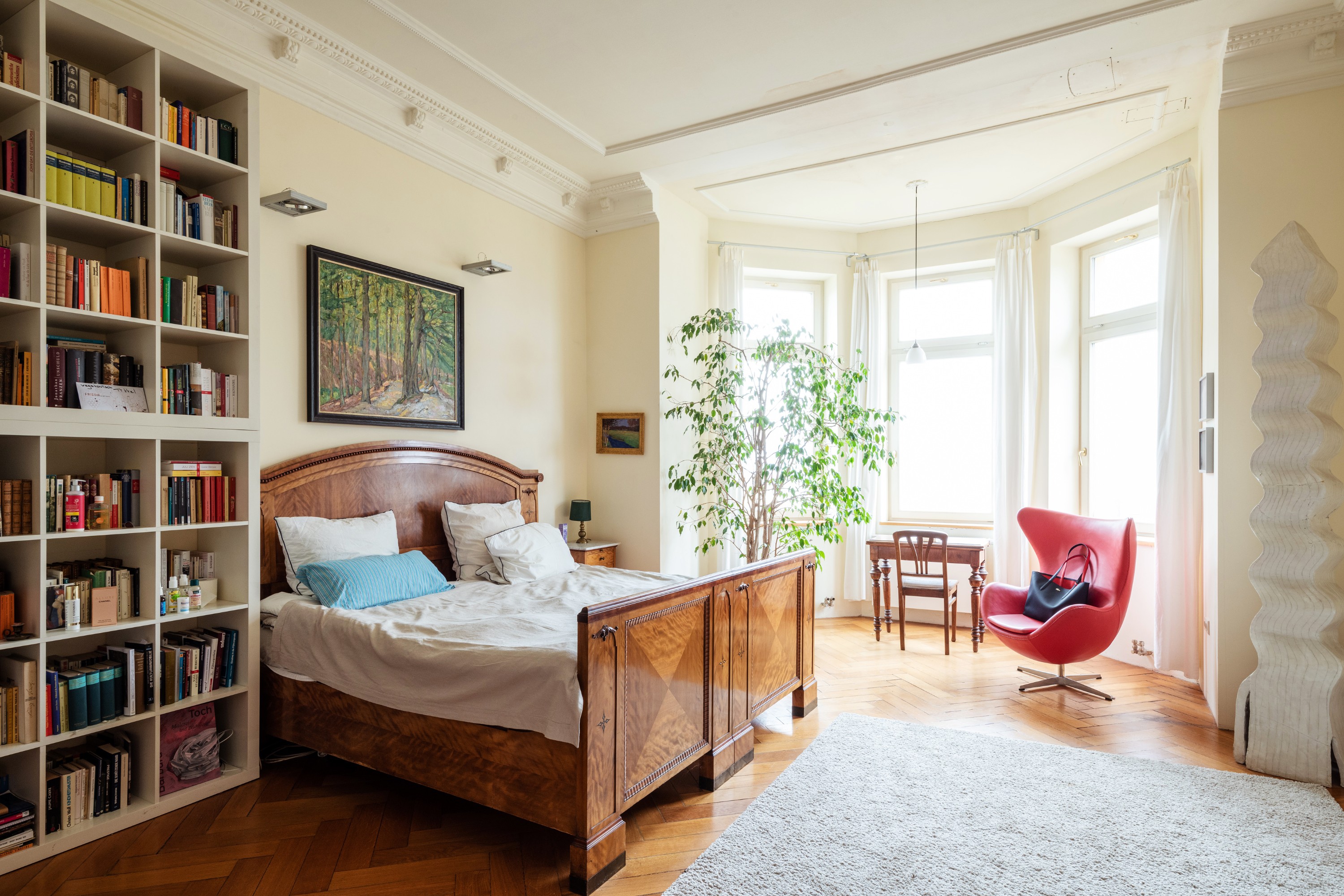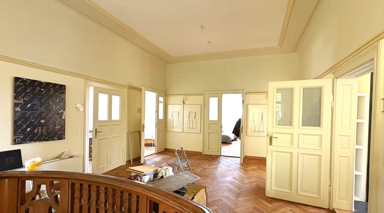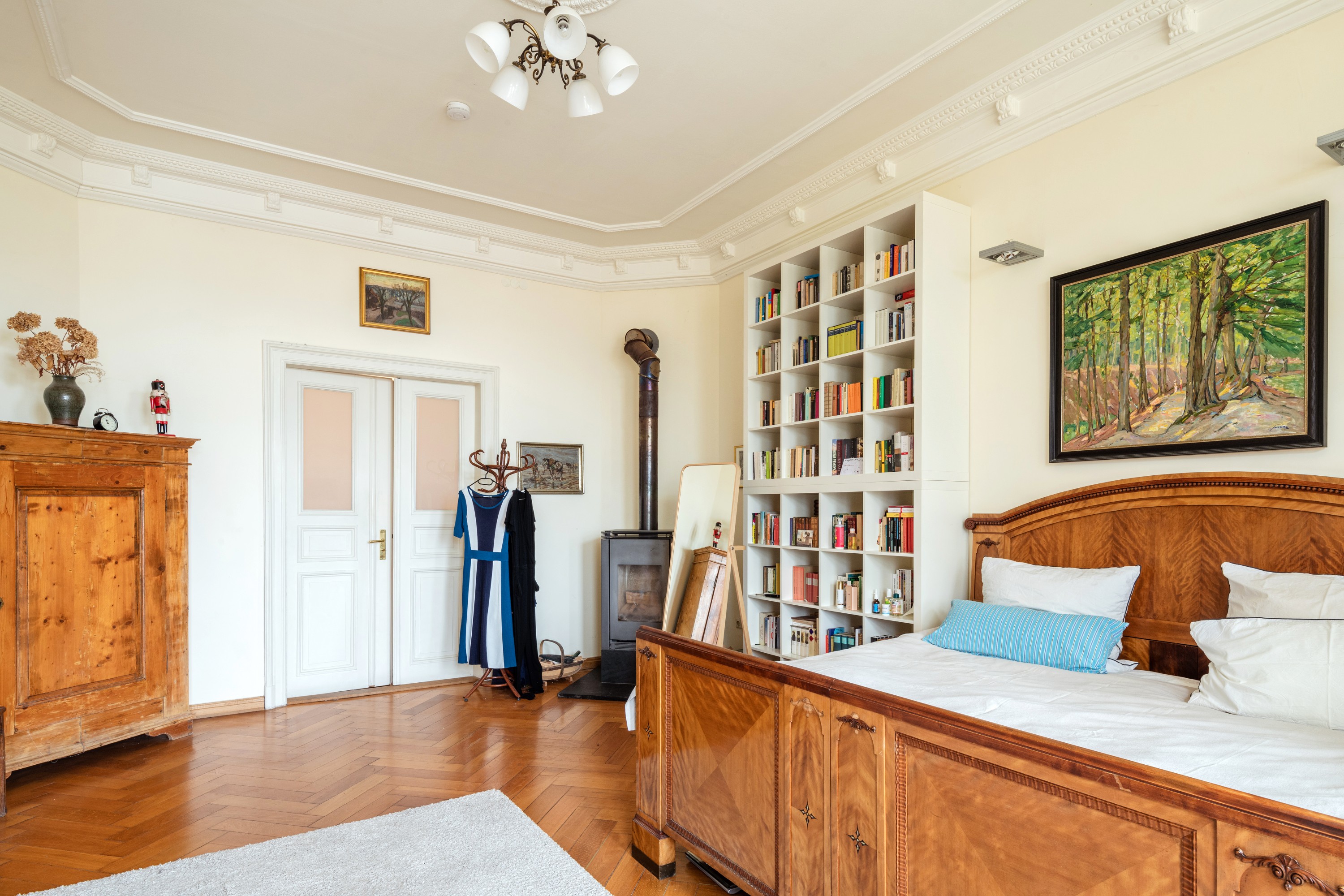 Doch nicht nur die Lage und die Außenfassade sind eindrucksvoll, sondern ebenso das Innere der Villa: hohe Decken, Eichenvollholzparkett sowie die Deckenstuckelemente und originalen Türen und Fenster machen den Charme der Wohnung aus.