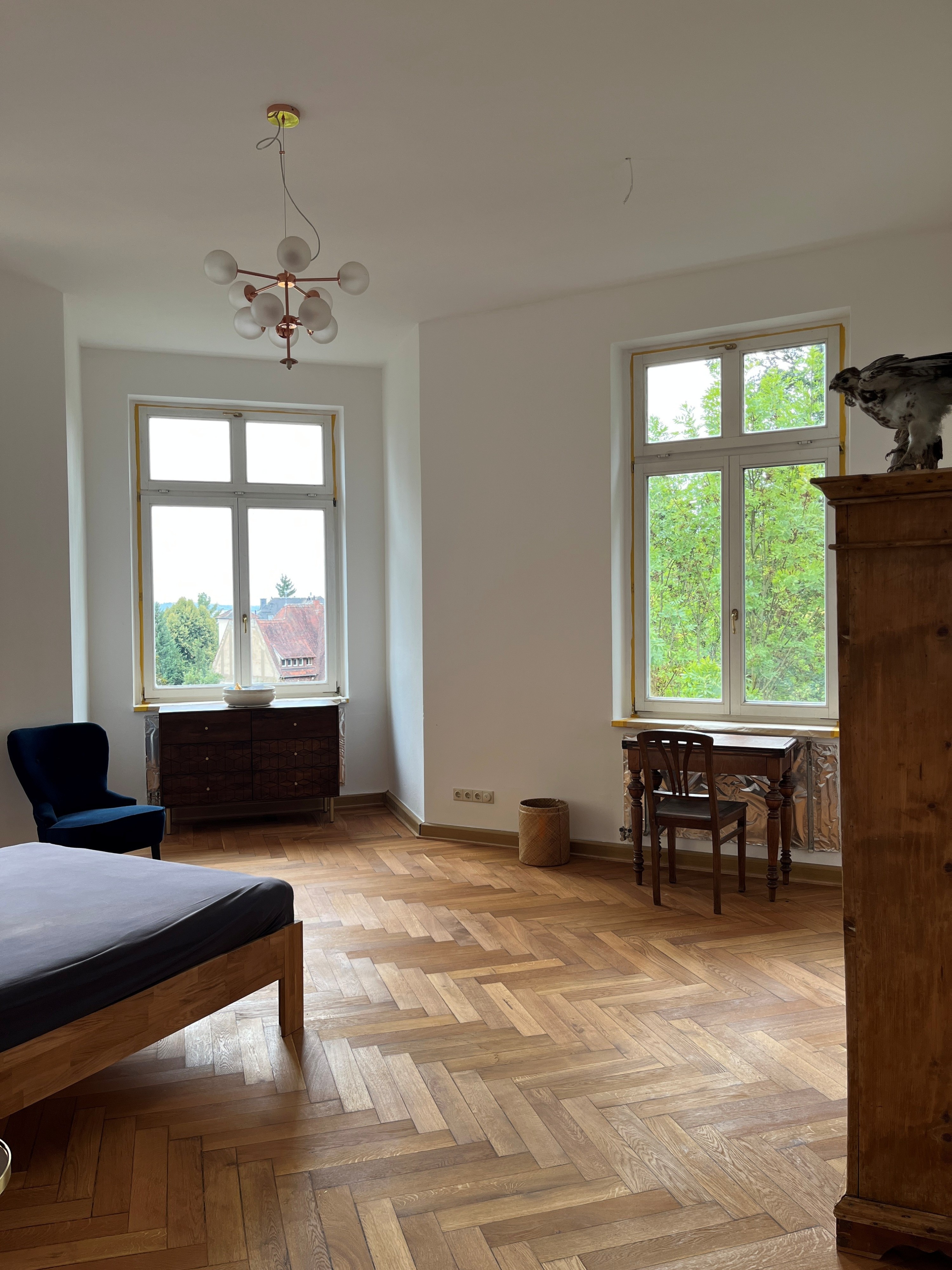 Parkett in der Wohnung geschliffen und mit 2K Öl geölt, Fußleisten aus Eiche, Trockenbauwand als Wohnungstrennwand,
