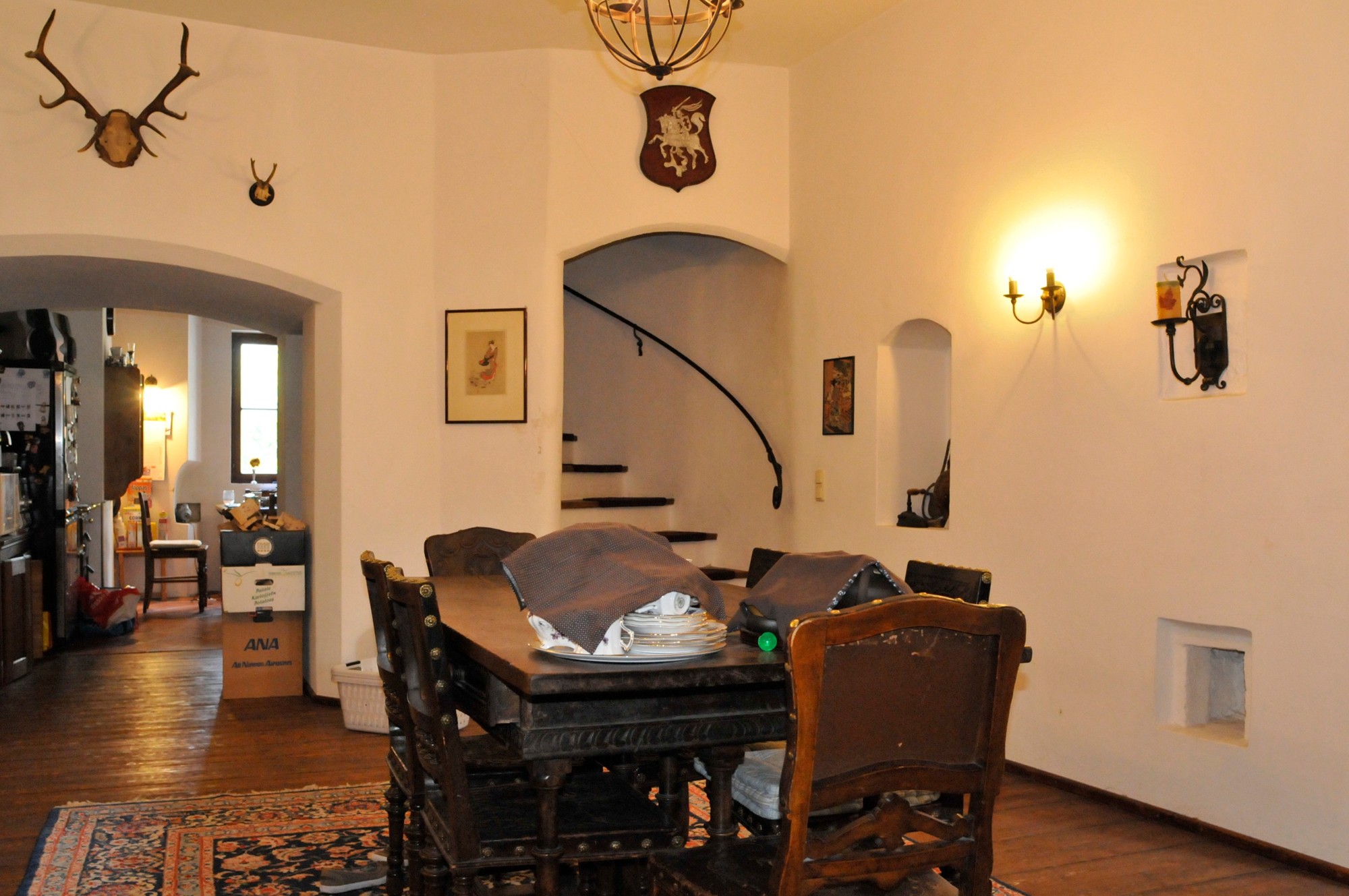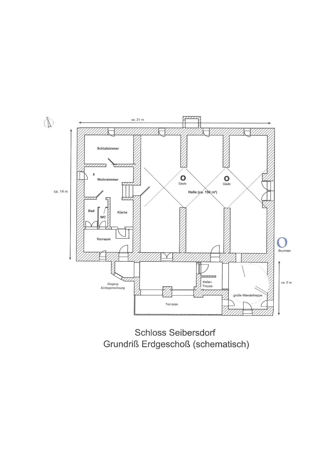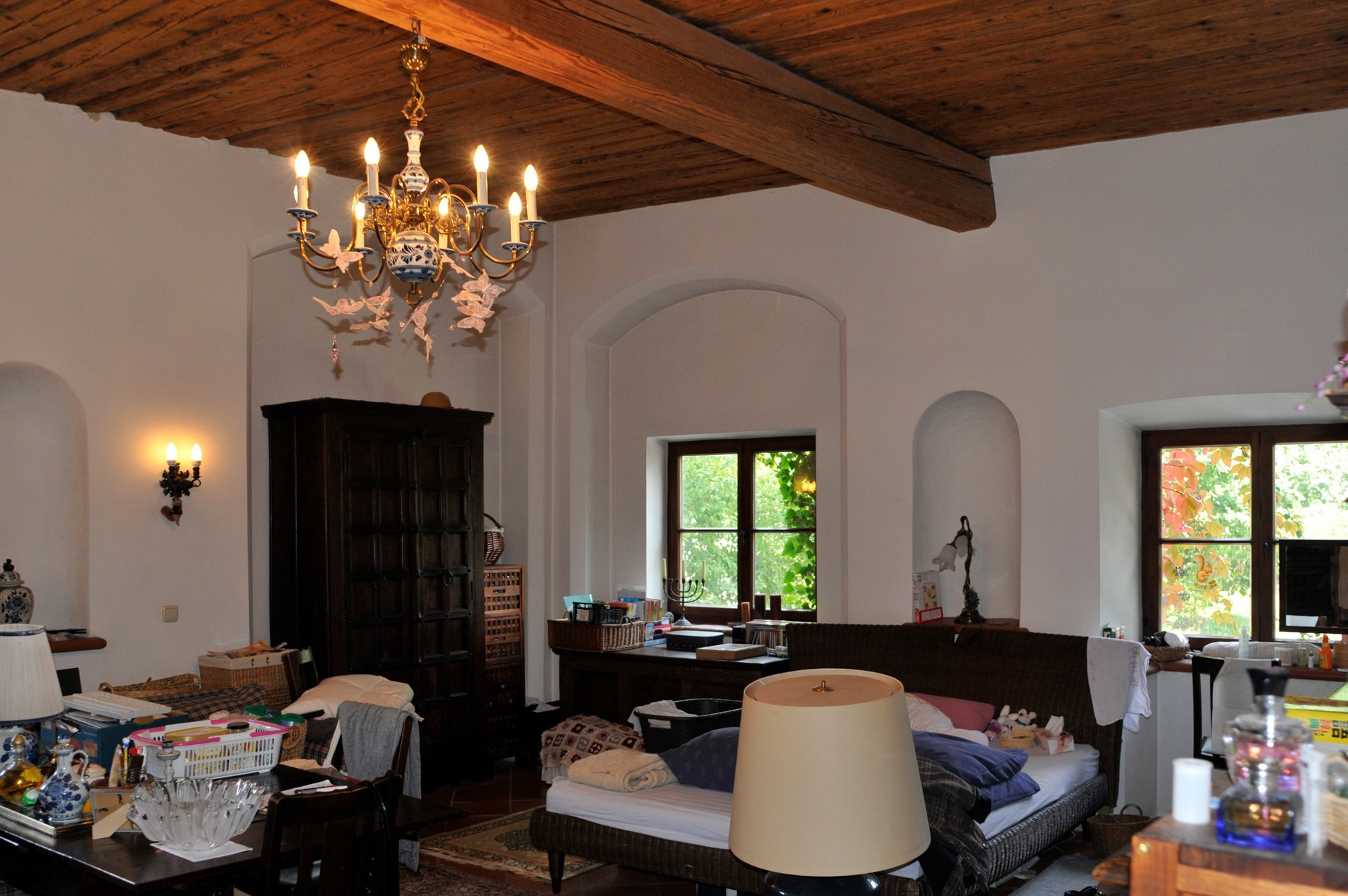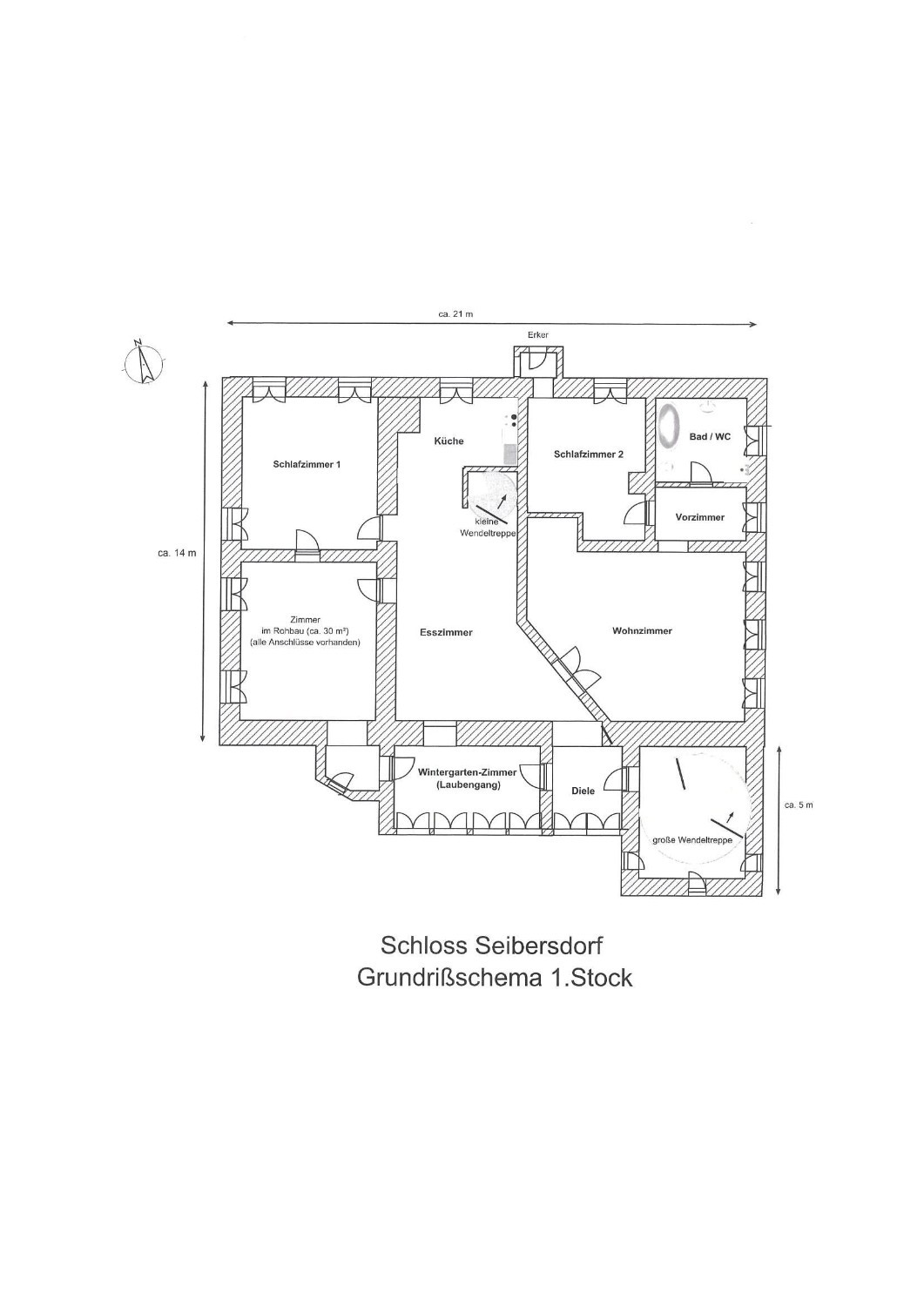 Das sehr solide und gesunde Schlossgebäude mit seinen bis zu 1 m starken Mauern, sowie den dicken Gewölbe- und Holzbalkendecken, wurde in den 90-ern aufwendig kernsaniert und wird wohl weitere 500 Jahre überstehen. Es wurde auf seine historischen Grundrisse zurückgebaut und teilweise neu errichtet, dabei statisch grundlegend überarbeitet (Ringanker, Abfangen des Gewölbeschubs, etc.) und auf einen modernen gehobenen Wohnstandard gebracht (alles neu: ZH, FBH, Sanitär, Elektro, Böden, Putz, Dach, Treppen, Garage). Zumal die letzte Renovierung ungefähr 30 Jahre zurückliegt, müssen je nach Art der Nutzung weitere Renovierungen und Umbauten vorgenommen werden. Das Schloss hat eine beherrschbare Größe, insbesondere wenn man nicht alle der 12 bis 15 "Zimmer" zu Wohnzwecken nutzt. Aufgrund dicker Tuffstein- und Ziegelwände und mehrfach verglaster Fenster erträgliche Heizkosten im Winter und angenehme Kühle während der Sommerhitze. Große Wendeltreppe vom Keller bis zum Dachboden mit separatem Zugang pro Etage, zusätzlich noch kleine interne Wendeltreppe von der Beletage (ca. 200m² Wohnung im 1.Stock, 1 Zi. im Rohbau) zum 2. Stock (die derzeitige Büroetage), Einbauküchen, Marmorbäder, 2-Zimmer-Einliegerwohnung im Erdgeschoß, davor ca. 150m²-Gewölbehalle mit Marmorsäulen, auch dort FBH, ein 100m²-Keller, ein ausbaubarer neuer Dachboden (ca. 7m hoch, 200m²). Nördlich an Straße angrenzend ein erschlossenes Baugrundstück (evtl. für zusätzliche Garagen oder ein Haus). Im Westen stilgerechte 50m²-Doppelgarage mit ferngesteuerten Holztoren, daneben ein Schuppen. Das Schloss hat natürlich Gemeindewasser, Kanalisation, Strom und schnelles Internet.