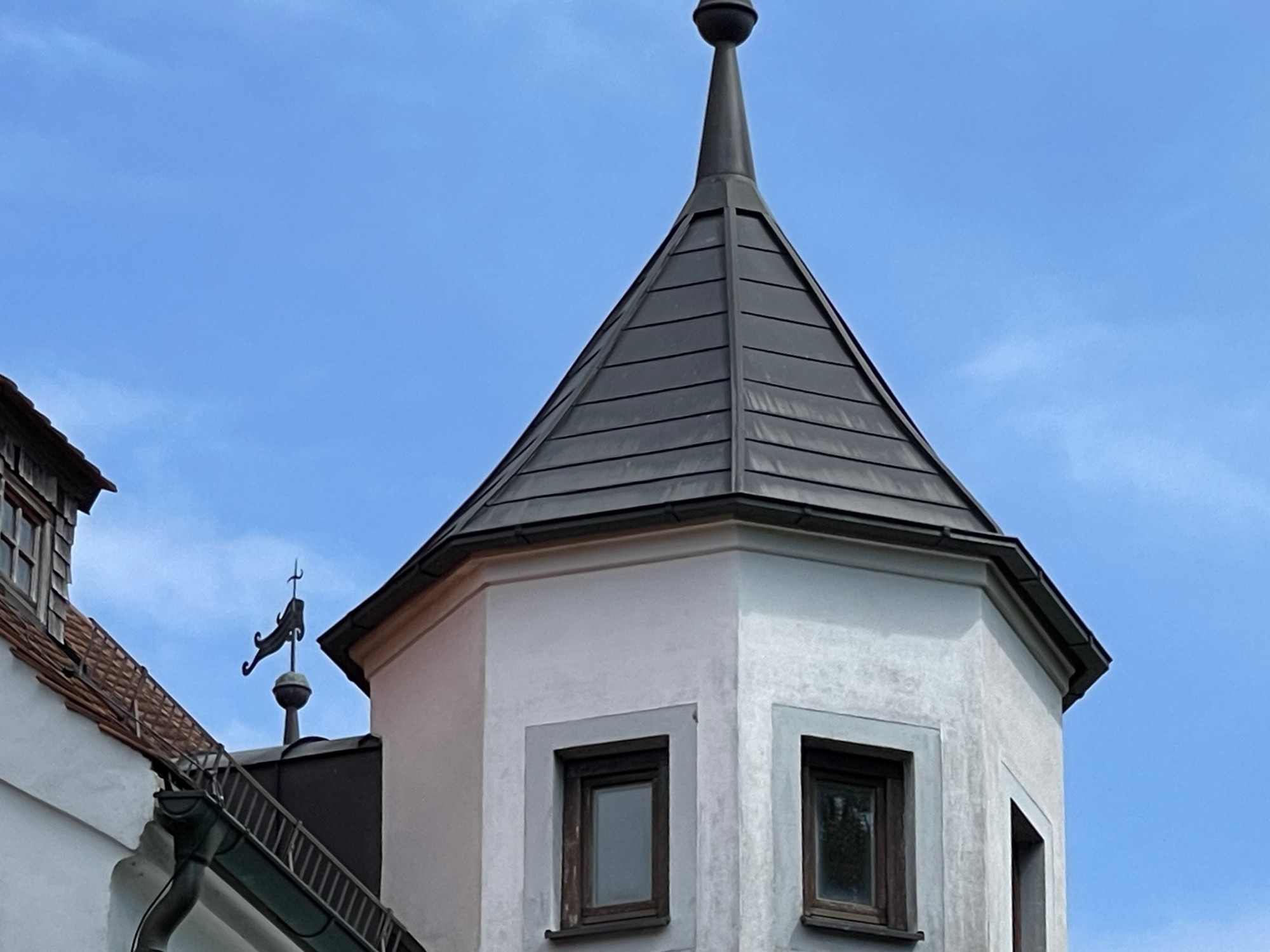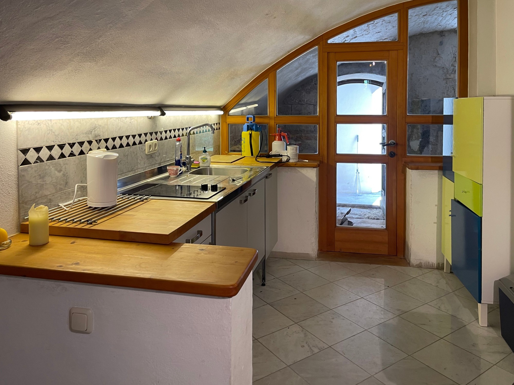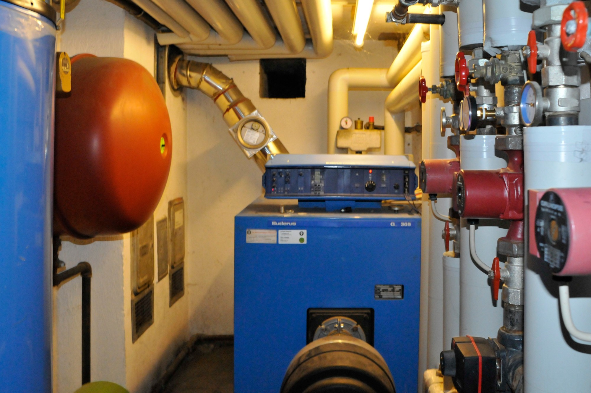 Das sehr solide und gesunde Schlossgebäude mit seinen bis zu 1 m starken Mauern, sowie den dicken Gewölbe- und Holzbalkendecken, wurde in den 90-ern aufwendig kernsaniert und wird wohl weitere 500 Jahre überstehen. Es wurde auf seine historischen Grundrisse zurückgebaut und teilweise neu errichtet, dabei statisch grundlegend überarbeitet (Ringanker, Abfangen des Gewölbeschubs, etc.) und auf einen modernen gehobenen Wohnstandard gebracht (alles neu: ZH, FBH, Sanitär, Elektro, Böden, Putz, Dach, Treppen, Garage). Zumal die letzte Renovierung ungefähr 30 Jahre zurückliegt, müssen je nach Art der Nutzung weitere Renovierungen und Umbauten vorgenommen werden. Das Schloss hat eine beherrschbare Größe, insbesondere wenn man nicht alle der 12 bis 15 "Zimmer" zu Wohnzwecken nutzt. Aufgrund dicker Tuffstein- und Ziegelwände und mehrfach verglaster Fenster erträgliche Heizkosten im Winter und angenehme Kühle während der Sommerhitze. Große Wendeltreppe vom Keller bis zum Dachboden mit separatem Zugang pro Etage, zusätzlich noch kleine interne Wendeltreppe von der Beletage (ca. 200m² Wohnung im 1.Stock, 1 Zi. im Rohbau) zum 2. Stock (die derzeitige Büroetage), Einbauküchen, Marmorbäder, 2-Zimmer-Einliegerwohnung im Erdgeschoß, davor ca. 150m²-Gewölbehalle mit Marmorsäulen, auch dort FBH, ein 100m²-Keller, ein ausbaubarer neuer Dachboden (ca. 7m hoch, 200m²). Nördlich an Straße angrenzend ein erschlossenes Baugrundstück (evtl. für zusätzliche Garagen oder ein Haus). Im Westen stilgerechte 50m²-Doppelgarage mit ferngesteuerten Holztoren, daneben ein Schuppen. Das Schloss hat natürlich Gemeindewasser, Kanalisation, Strom und schnelles Internet.