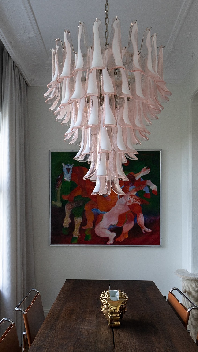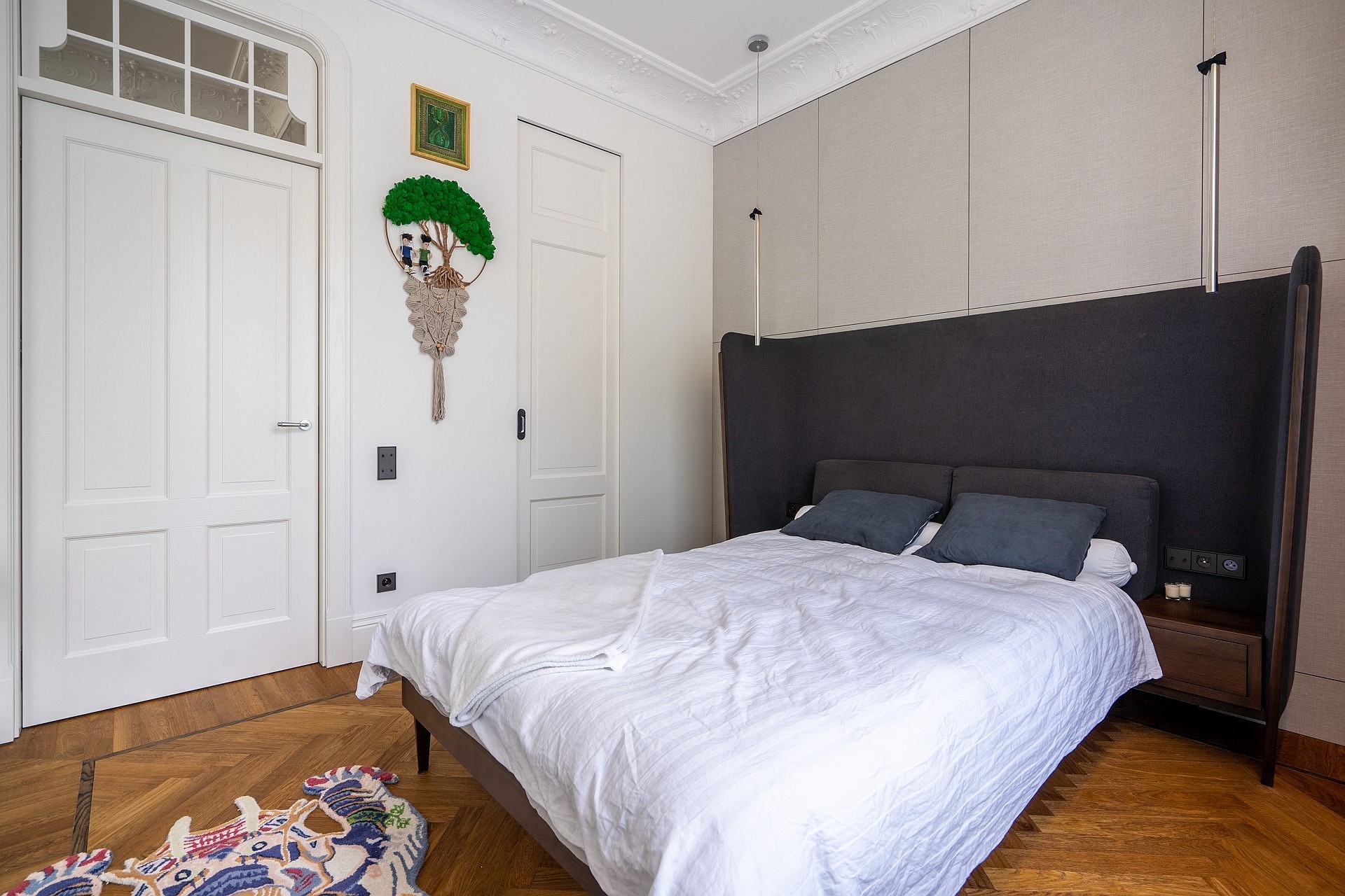 Originaler Eichenparkett im französischen Fischgrätmuster, Stuckverzierungen an Wänden und Decken, maßgefertigte Möbel. Deckenhöhe über drei Meter. Große Fenster sorgen für gute Tageslichtversorgung.