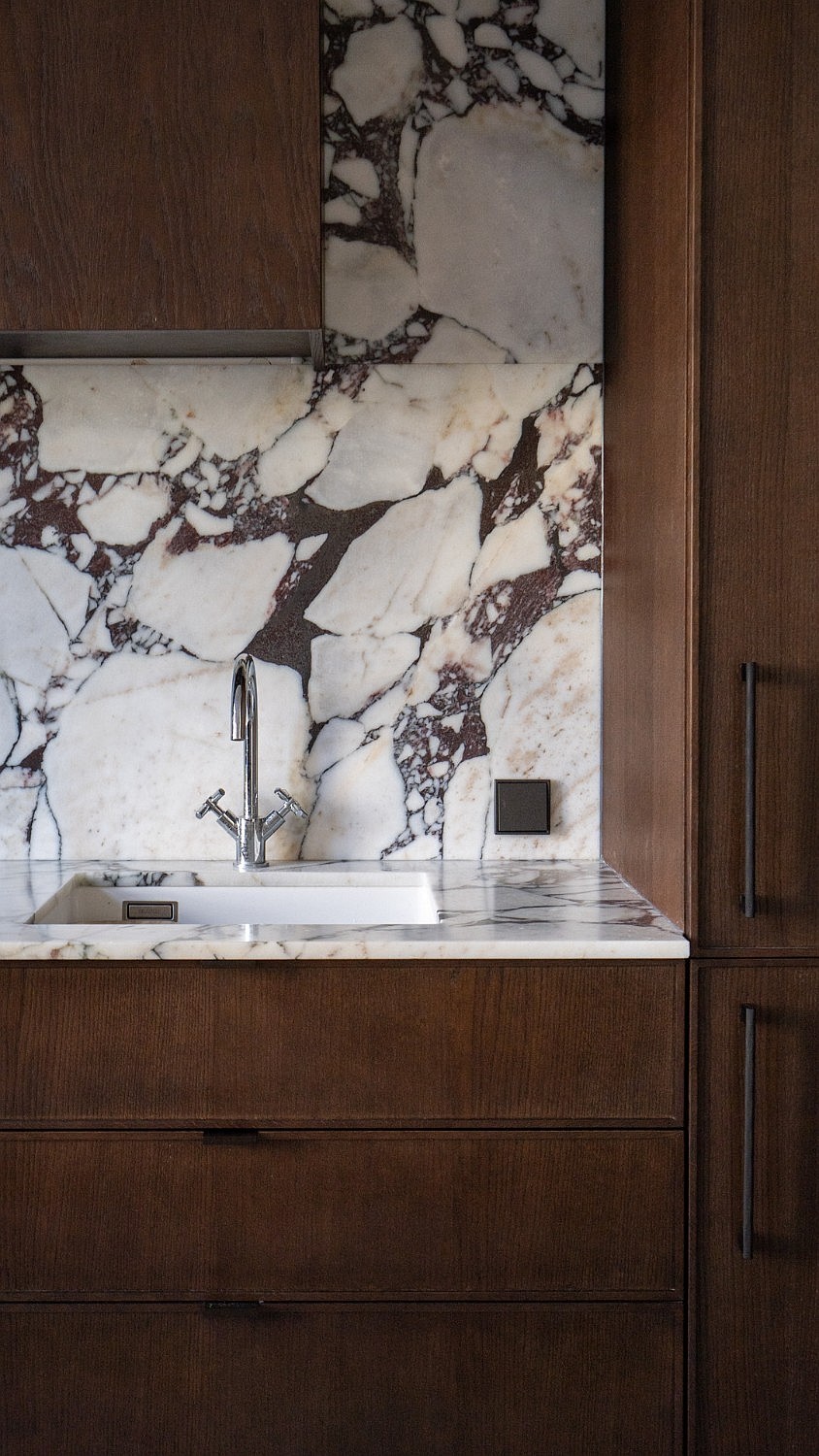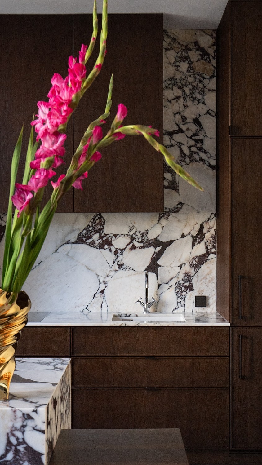 Der Wohnraum ist in einen Sitzbereich und einen Küchen-Essbereich mit Tisch für vier bis sechs Personen gegliedert. Die Küchenzeile ist mit dunklem Mobiliar und Steinarbeitsplatte ausgeführt; Ausstattung: Induktionskochfeld, Geschirrspüler, Kühl-Gefrier-Kombination, Backofen und Dunstabzugshaube. Vom Wohnraum Zugang zur verglasten, sonnenseitigen Veranda.
