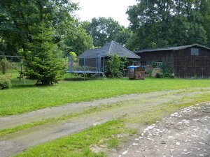 zwei Nebengebäude, darunter eine ehemalige Garage und ein separates kleines Gebäude mit Grillbereich.