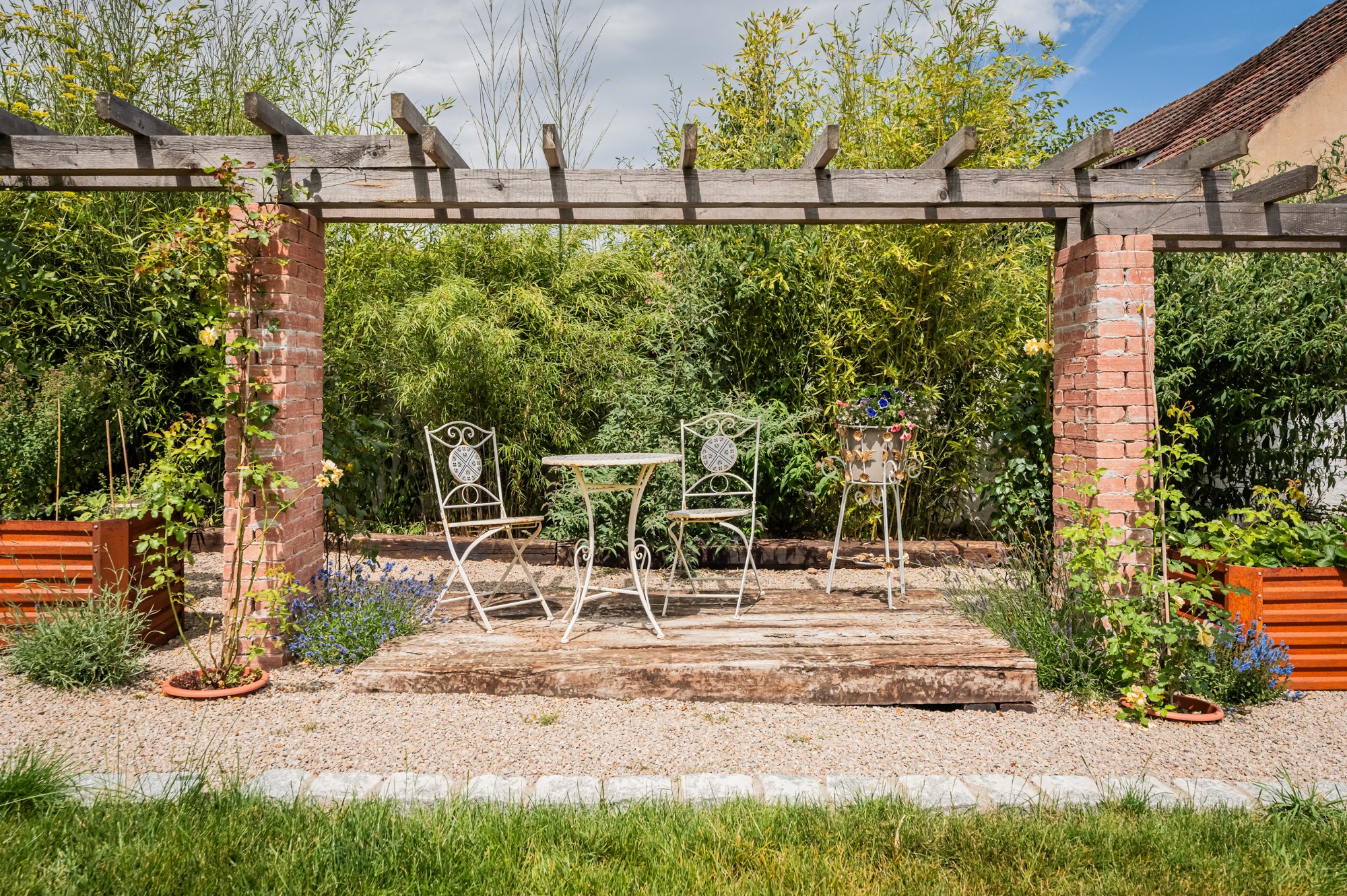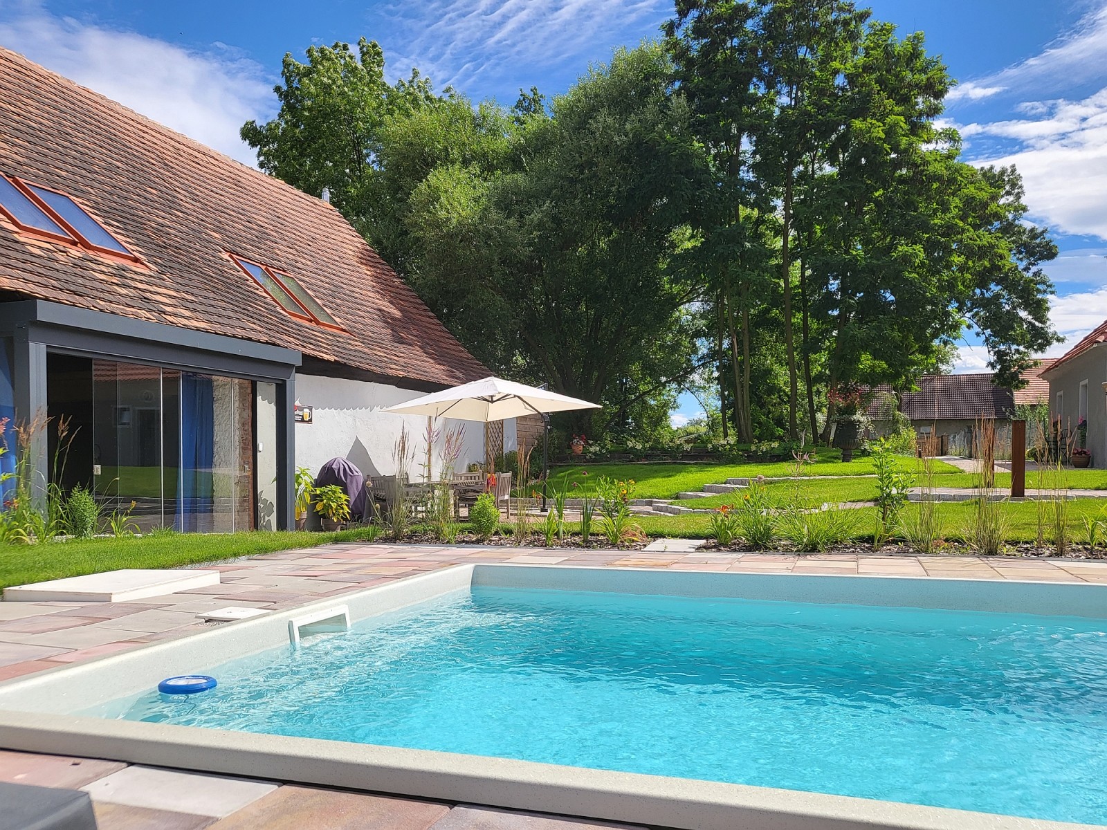 Unser Ziel war von Anfang an, das Anwesen nicht kommerziell zu nutzen – deshalb haben wir auch auf Fördermittel verzichtet. Aufgrund unserer großen Familie war das Schloss von Beginn an als rein privates Refugium konzipiert, mit der Möglichkeit, jederzeit Familienmitglieder, Freunde und Gäste willkommen zu heißen. Wir sind gerne Gastgeber und daher war es uns wichtig, das Alte und Große trotzdem angenehm und gemütlich zu gestalten, damit sich jeder hier wohlfühlt. Eine besondere Rolle spielt die restaurierte Scheune, die in ihrer Größe und Lage selbstverständlich auch kommerzielle Nutzung zuließe. Ebenso der beheizte Außenpool und der direkt daneben gelegene alte Schlossweiher mit seinen grünen Ecken – eine gelungene Symbiose zwischen Alt und Neu.