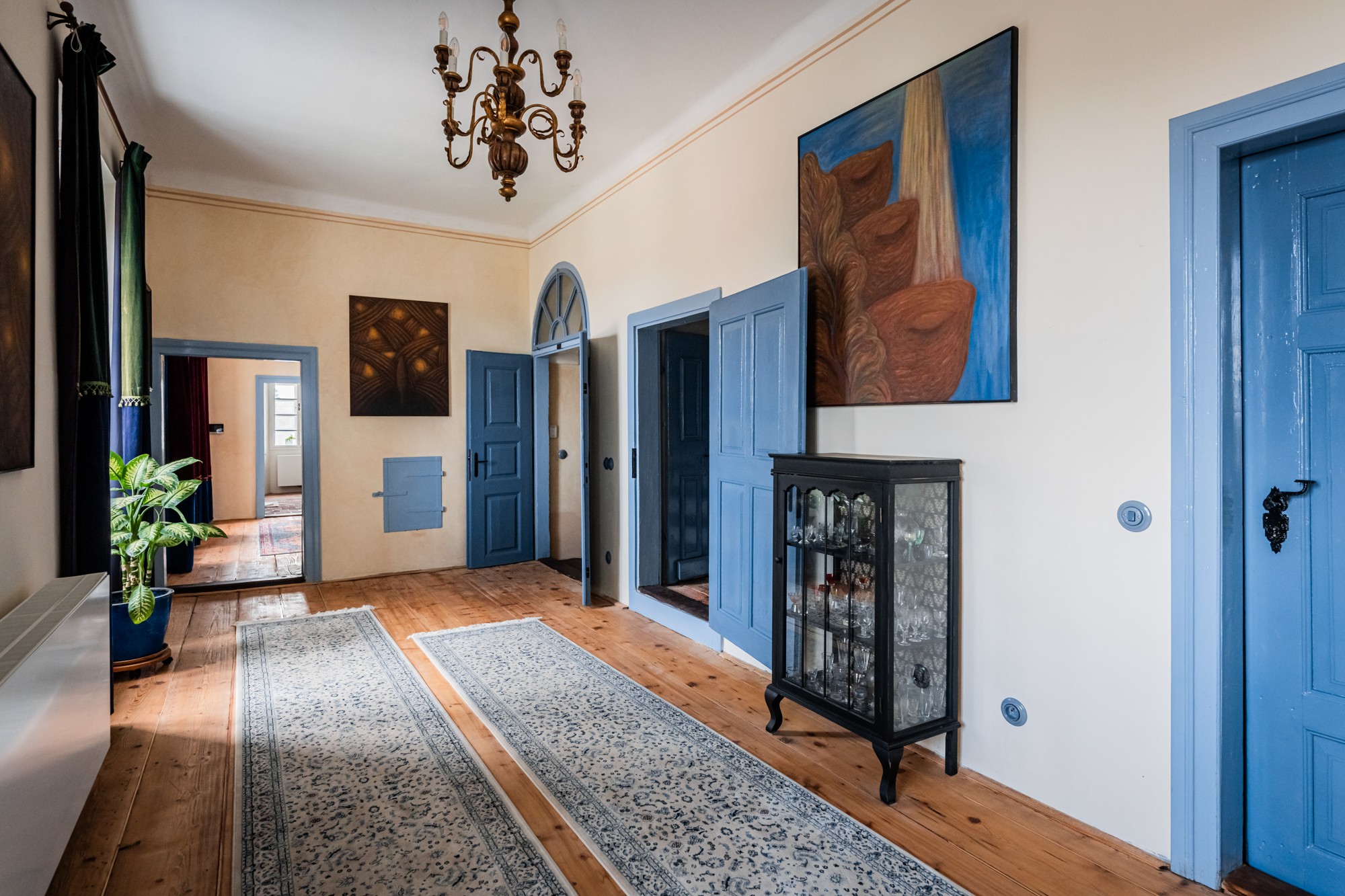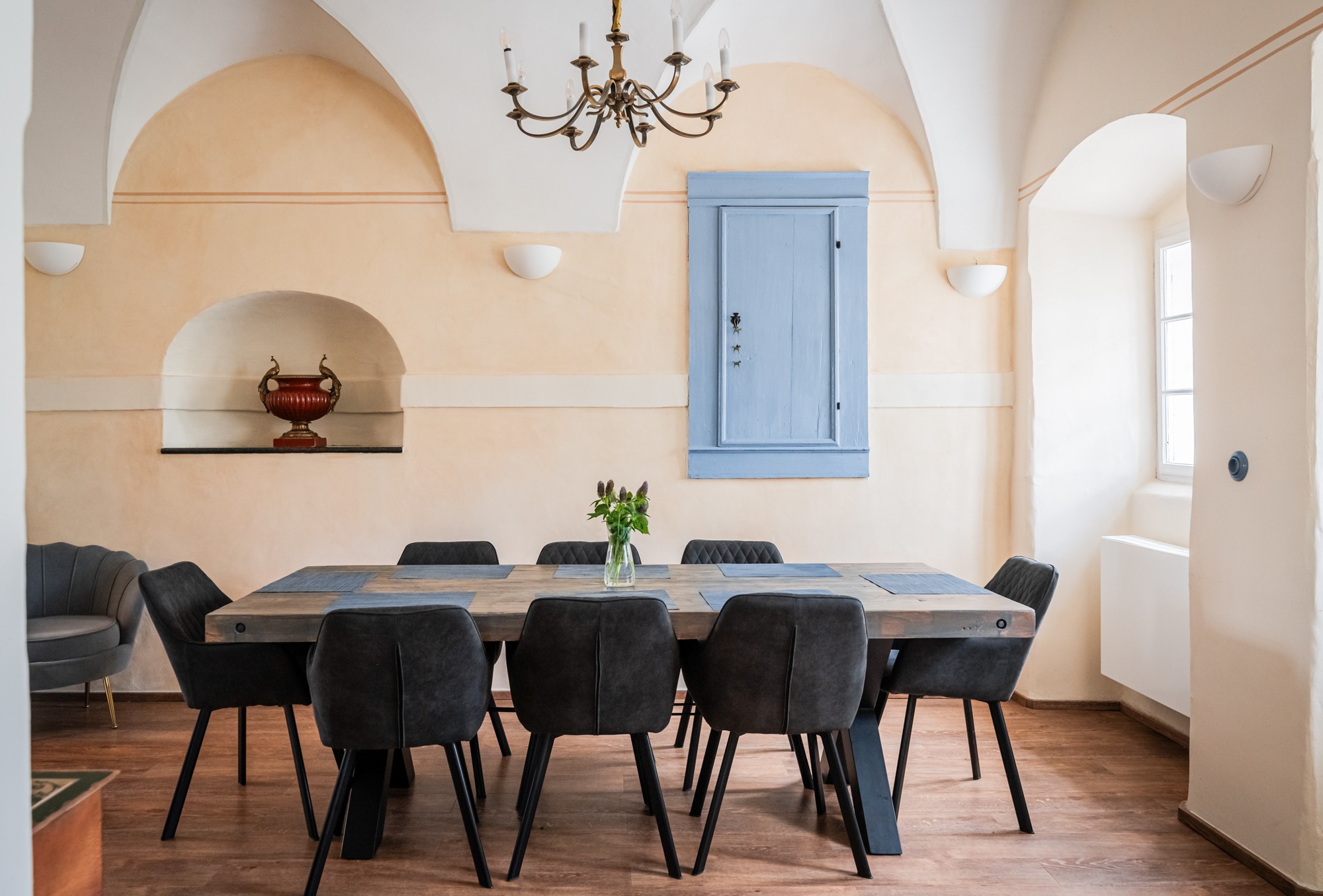 Das Schloss haben wir in grau-blauen Tönen gestaltet – eine typische Farbe der rauen südböhmischen Renaissance und zugleich die Farbe der Schwarzenberger, der damaligen Eigentümer des Anwesens. Auch dies ist ein Abdruck der Geschichte, sichtbar in jedem Raum.