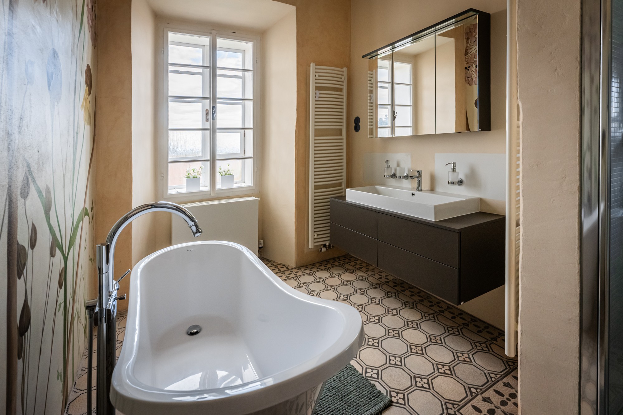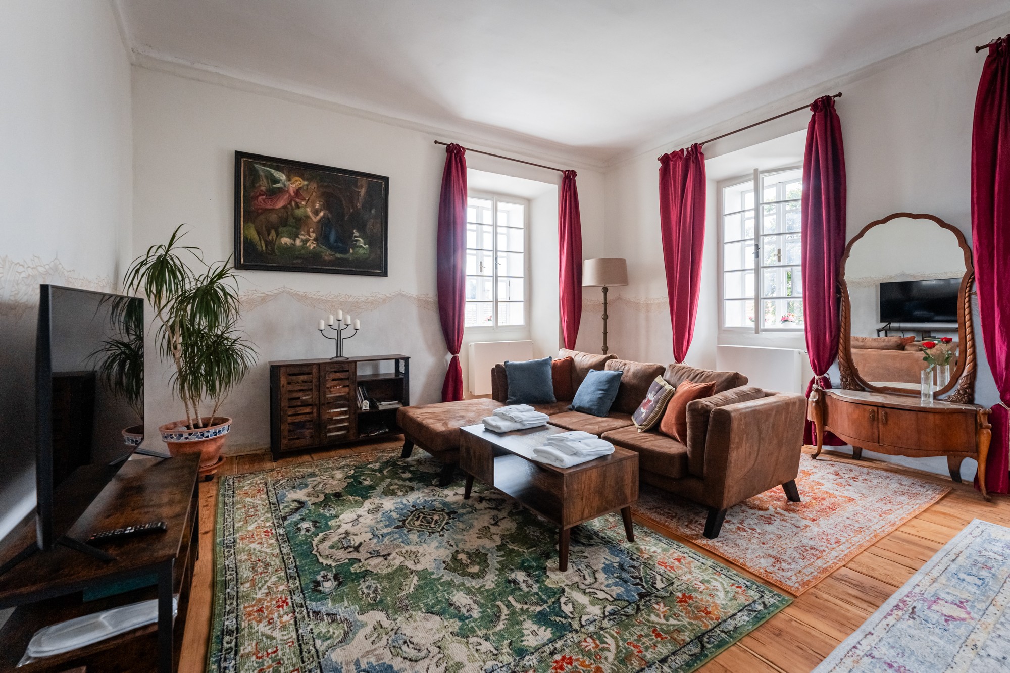 Die Innenräume haben wir eklektisch möbliert – keine museale Strenge, sondern spielerische Kombinationen aus Epochen, Farben, Stilen. Es ging uns nicht um historische Reinheit, sondern um Lebendigkeit. Wer hier eintritt, spürt sofort: Dieser Ort wurde nicht inszeniert, sondern gelebt.