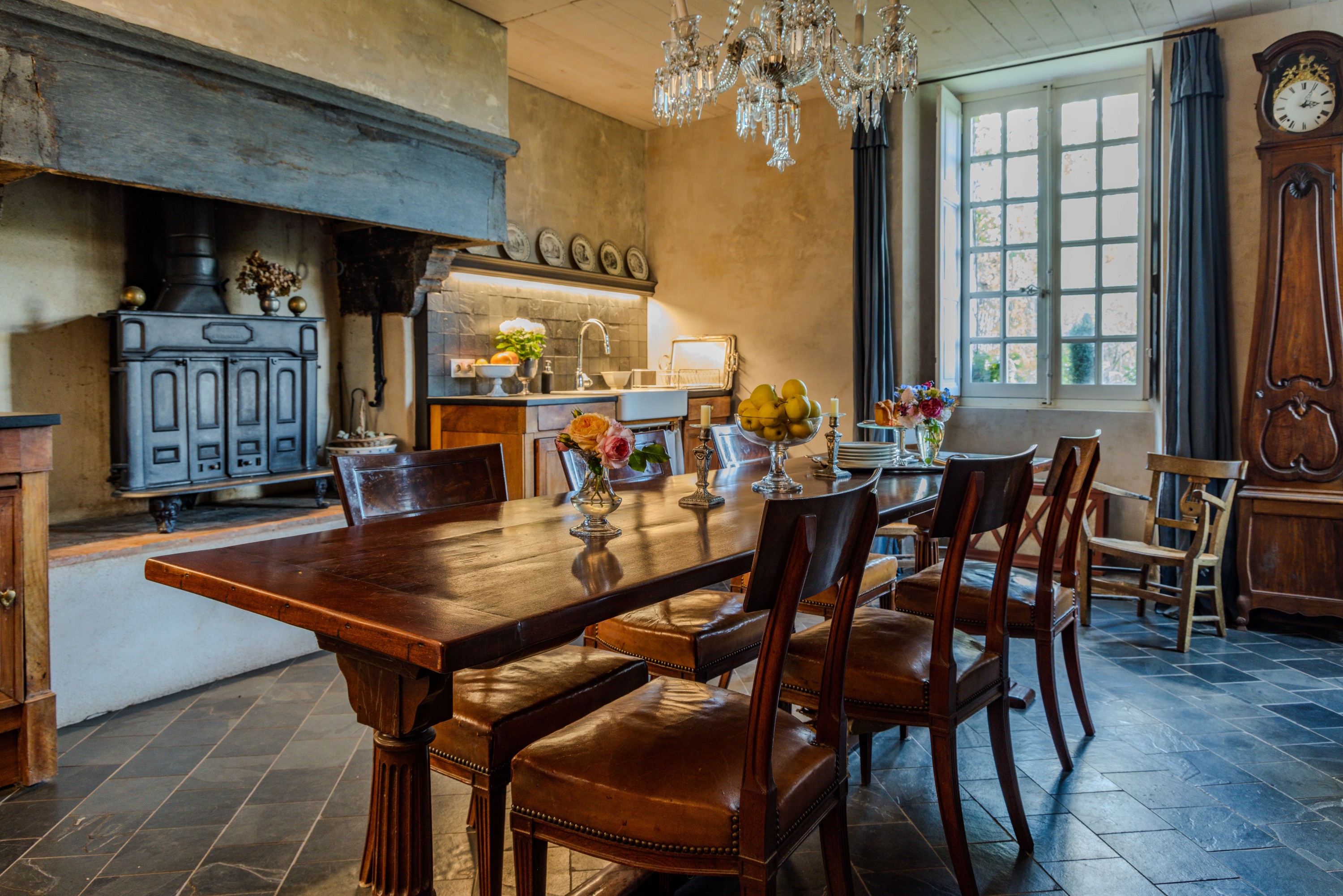 Kjøkkenet er romslig og koselig, med rikelig plass til et spisebord, perfekt for familiemiddager eller sosiale sammenkomster. Den hvite treloftet og de skifferbelagte gulvene og arbeidsflatene skaper en harmonisk atmosfære. Den tradisjonelle peisen med enkel ramme understreker rommets opprinnelige formål, som det fortsatt bærer preg av. Moderne utstyr er diskret integrert i denne historiske romløsningen.