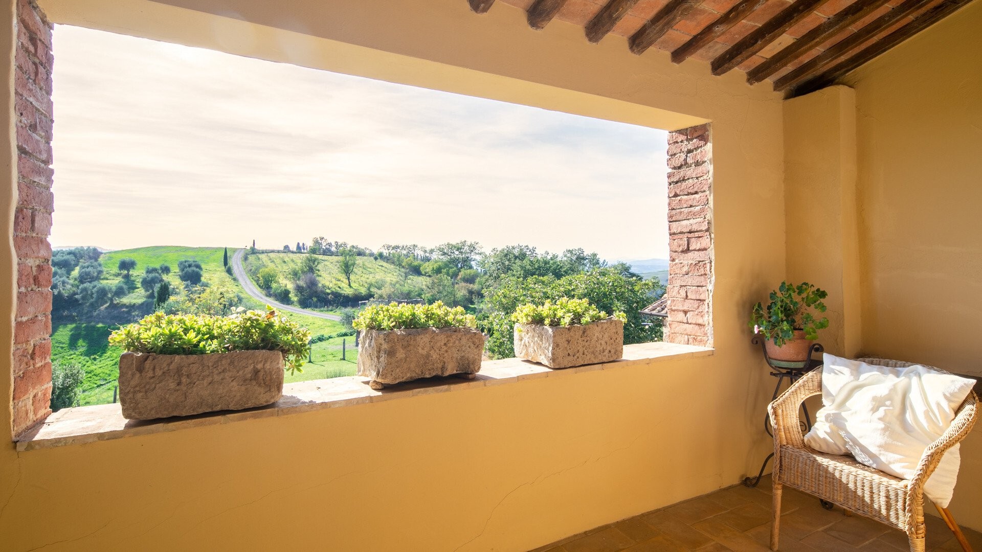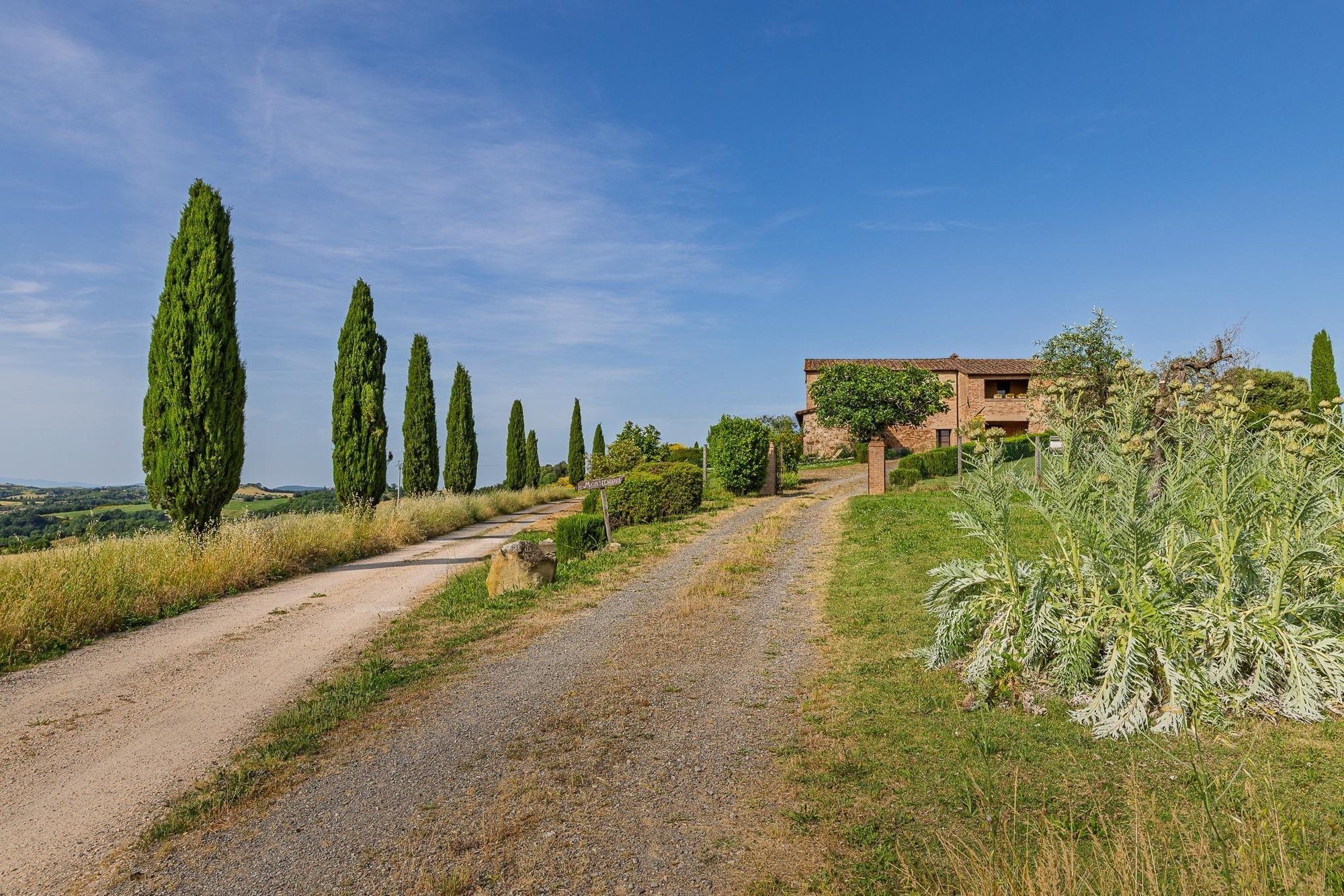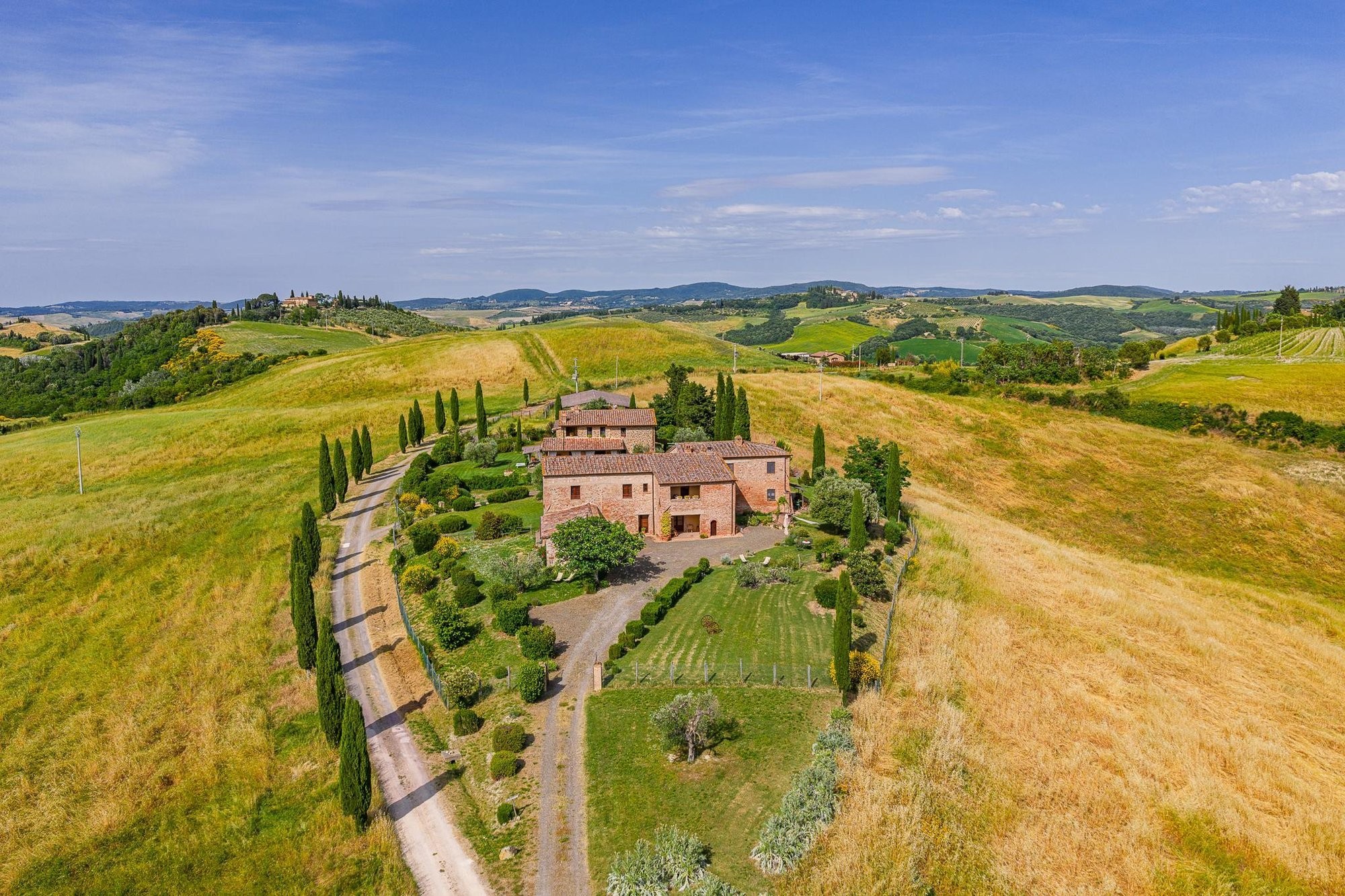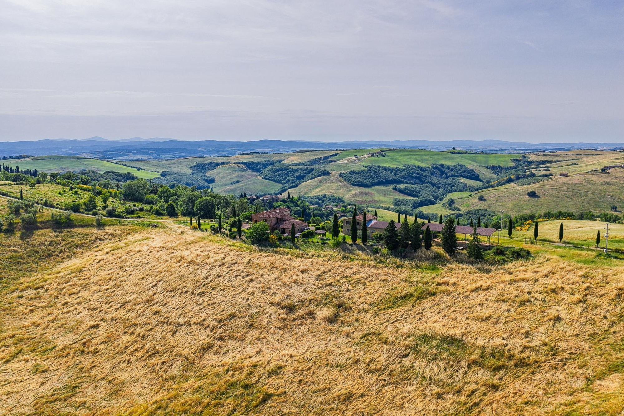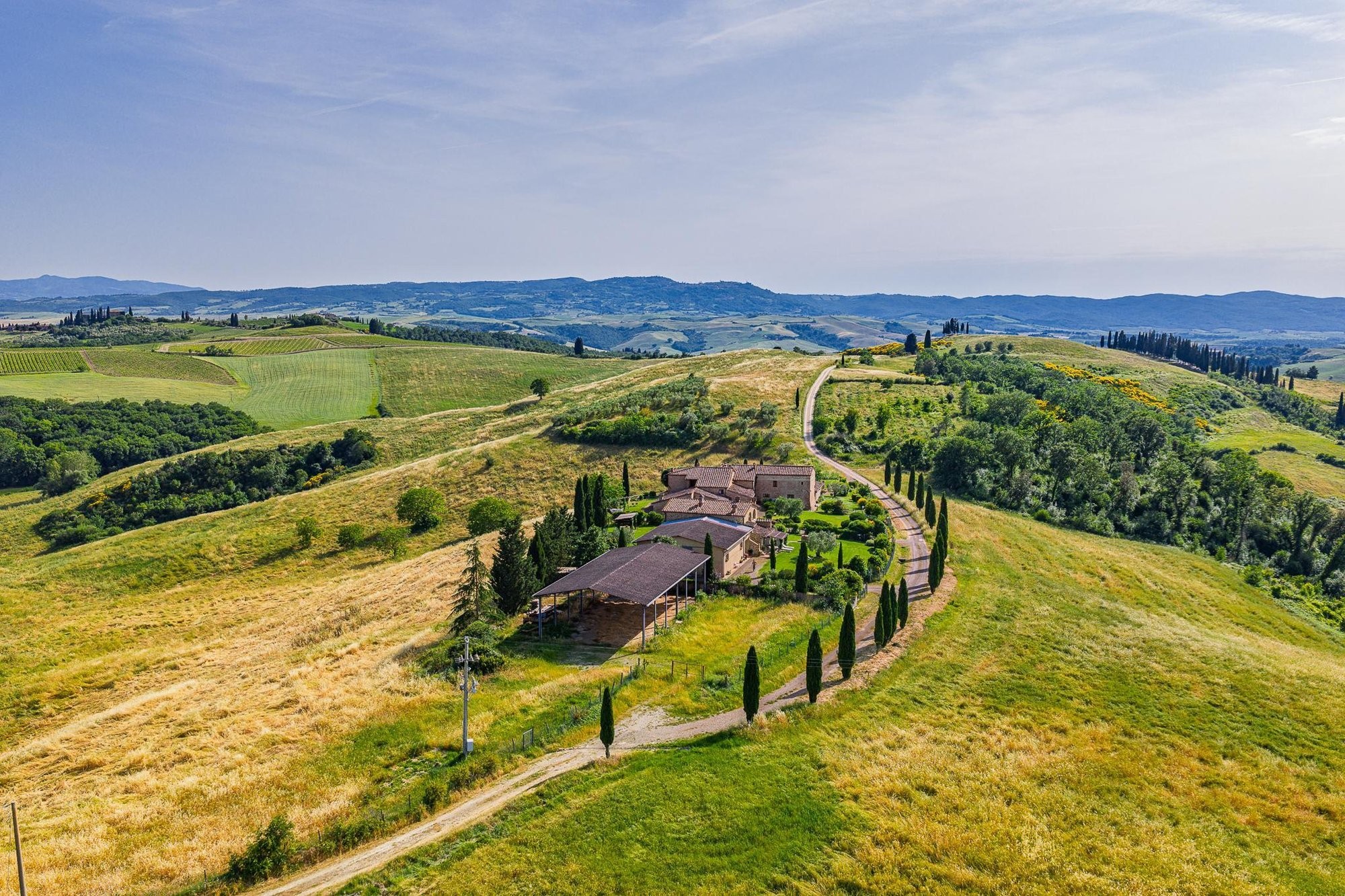 Midt i det bølgende landskapet mellom Brunello-vinmarkene i Val d’Orcia, ligger denne 40 hektar store eiendommen – et sted der tradisjon, natur og rom for utvikling møtes. Fra den naturlige høyden ser man nordover mot Sienas tårn, østover mot klosteret Sant’Anna i Camprena og, på klare dager, helt til Pienzas karakteristiske skyline.