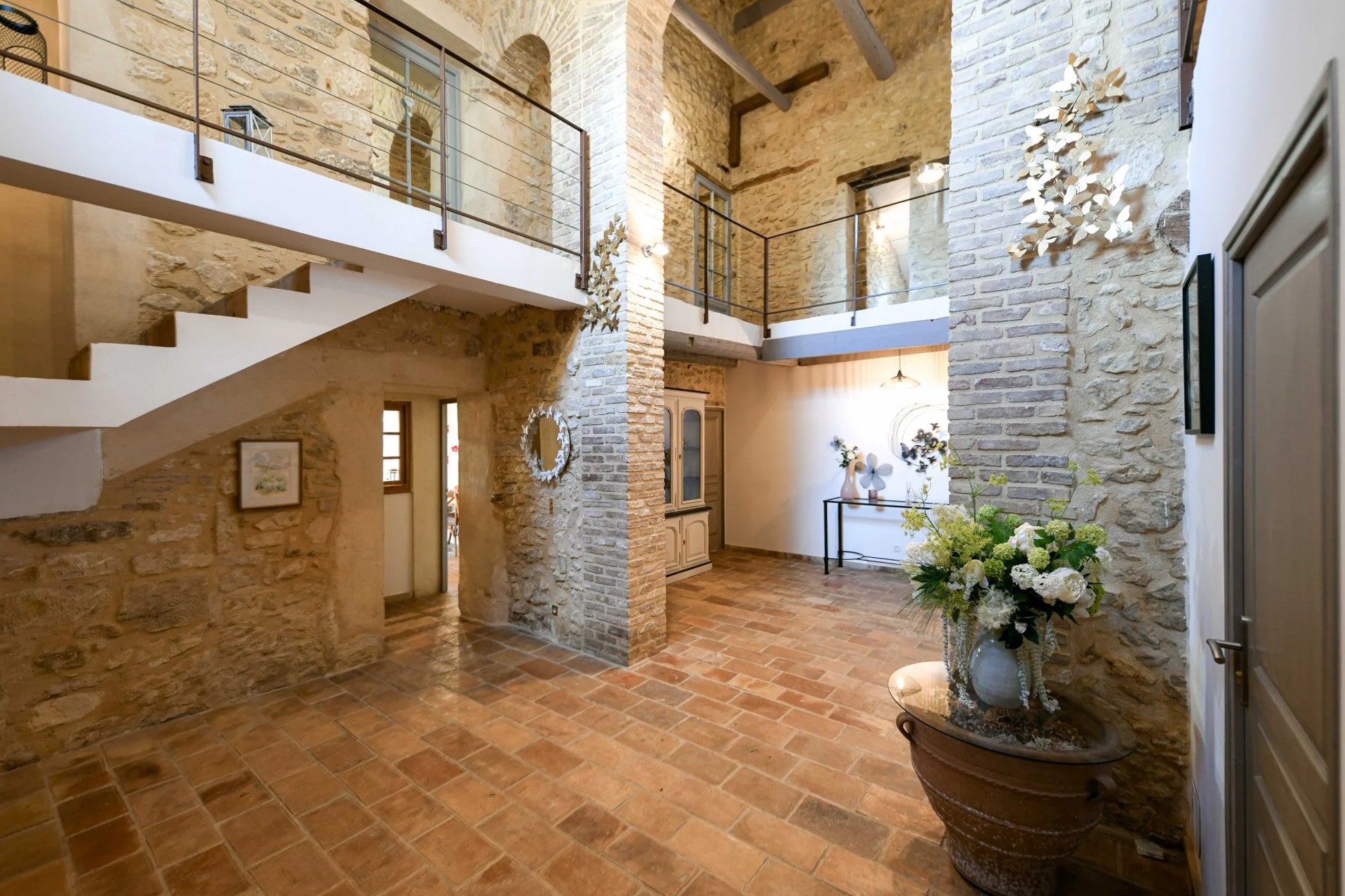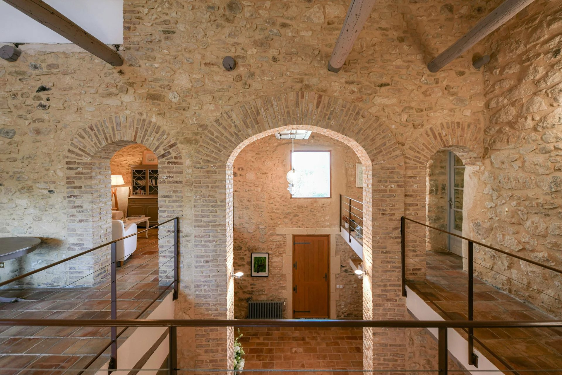 Hovedbygningen dekker 368 m². I første etasje finnes romslige representasjonsrom på totalt over 107 m². Den to etasjer høye inngangshallen imponerer med sitt volum og elegante design. En innvendig galleri gir oversikt over rommet og fremhever villaens historiske karakter. Til venstre forbinder den store stuen gjennom to steinbuer spisestuen, som igjen åpner mot det fullt utstyrte kjøkkenet. Tallrike vinduer og terrassedører sikrer rikelig med naturlig lys. På motsatt side av hallen finnes to suiter (15 og 24 m²), vaskerom og gjestetoalett.