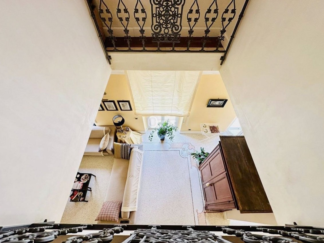 Andre etasje: Lys dobbel stue med peis og terrasser, kjøkken med spiseplass, separat spisestue, stort bad i Rosso Verona-marmor, inngangshall med venetiansk mosaikkgulv.