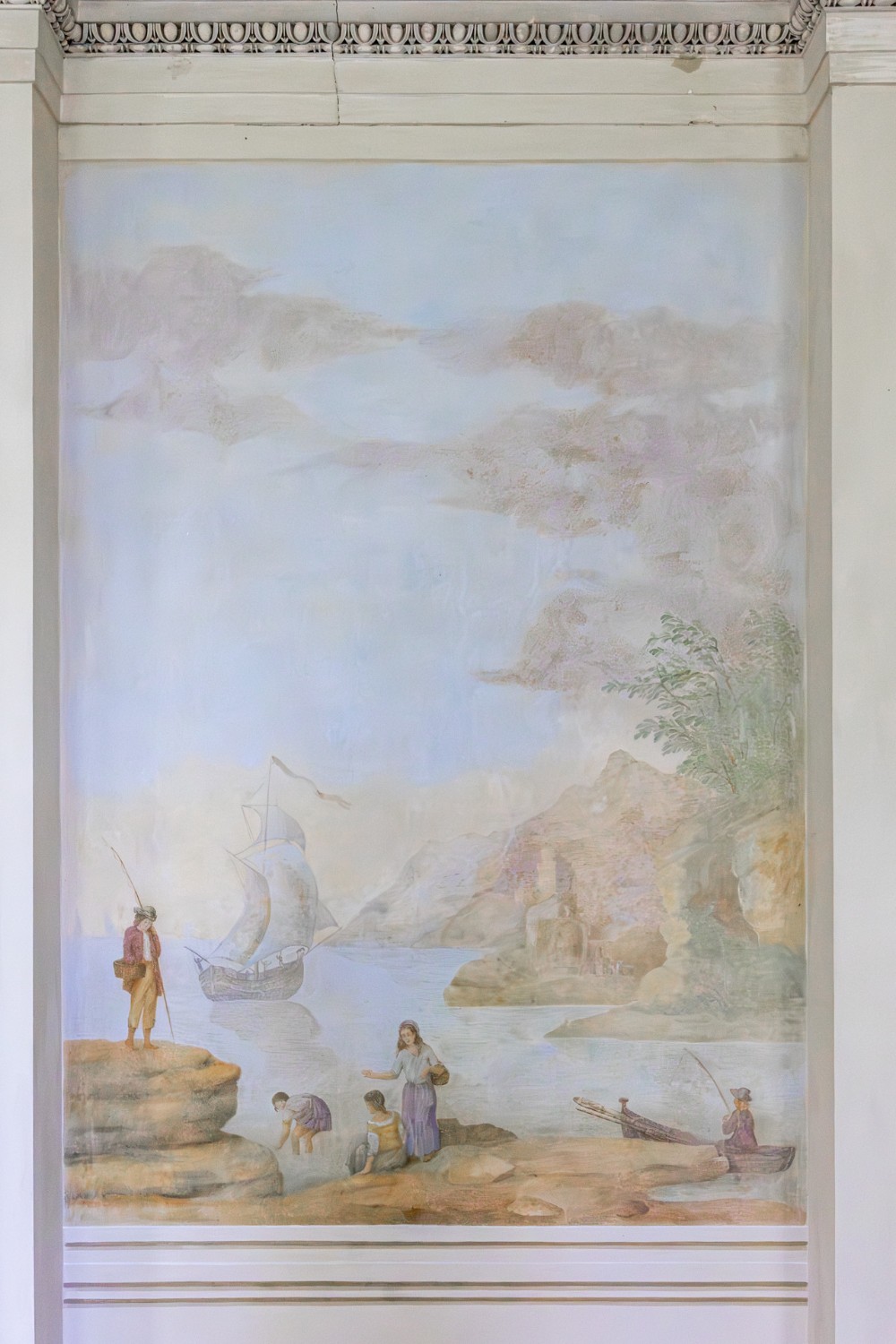 På övervåningen fanns de representativa bostadsrummen, däribland en stor matsal och en balsal med halvcirkelformade mosaikpelare. Balsalen är delvis restaurerad med bearbetade väggmålningar och förnyade fönster.