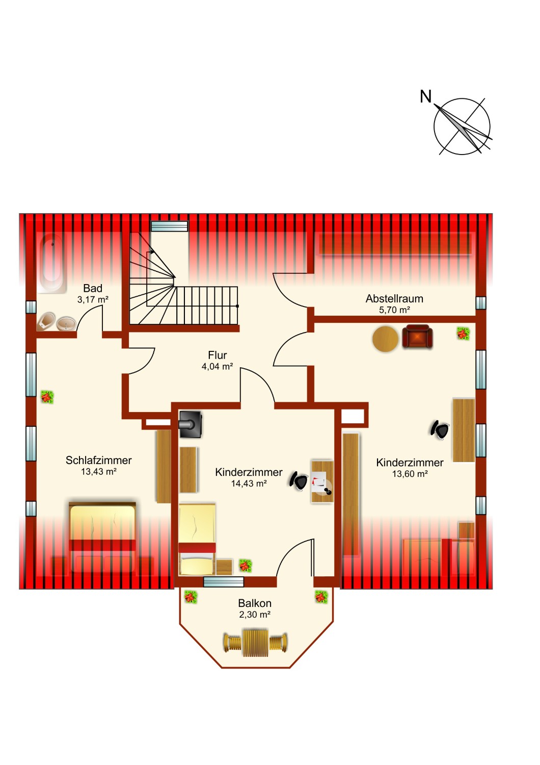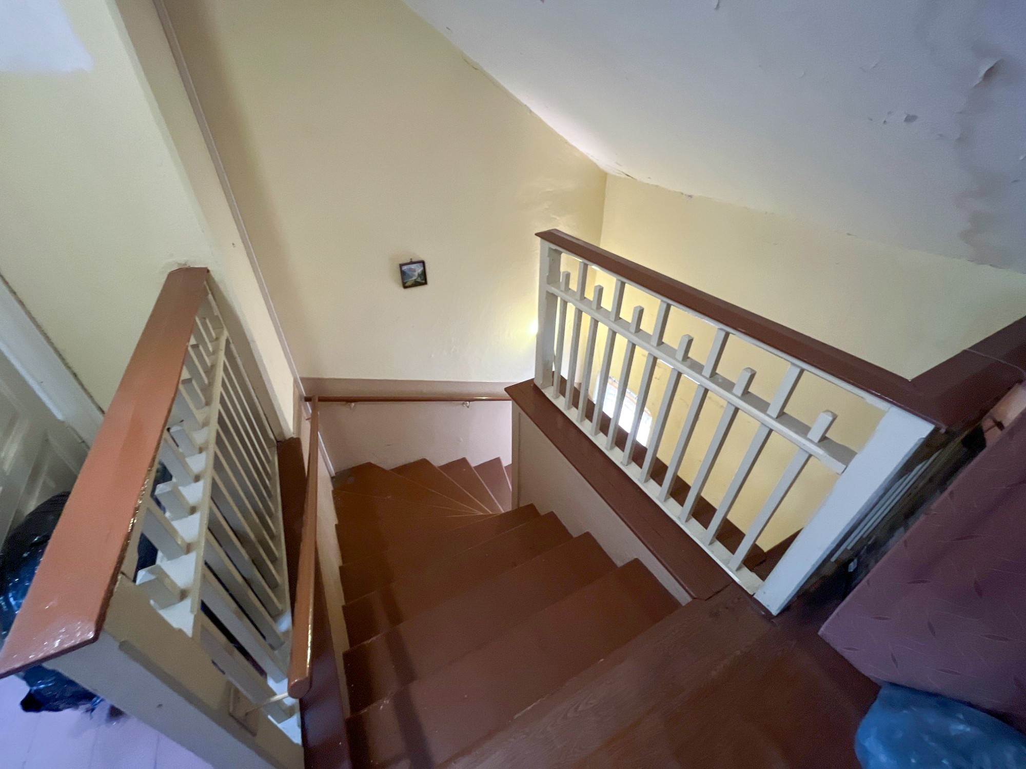 Övervåning: 3 rum, förråd, badrum (badkar, toalett), balkong, ca 56,67 m²