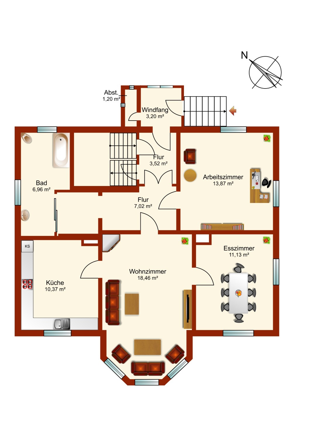 Entrévåning: 3 rum, kök, badrum (badkar, toalett), hall, förråd, ca 75,73 m²