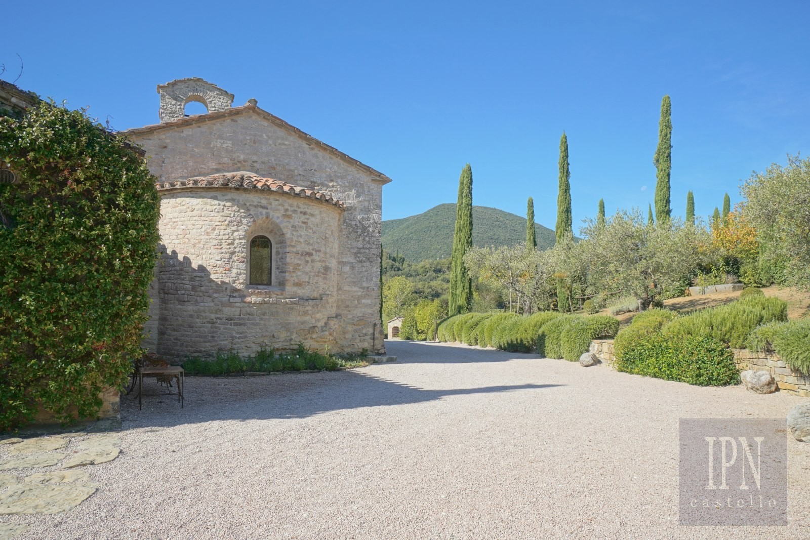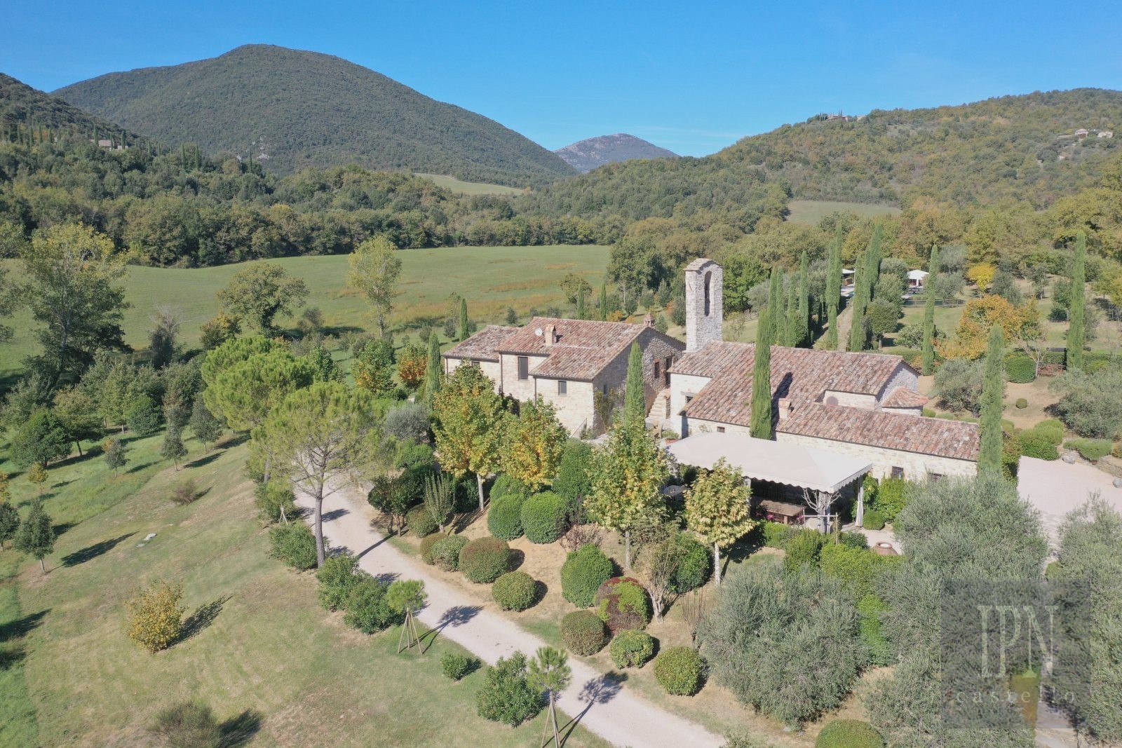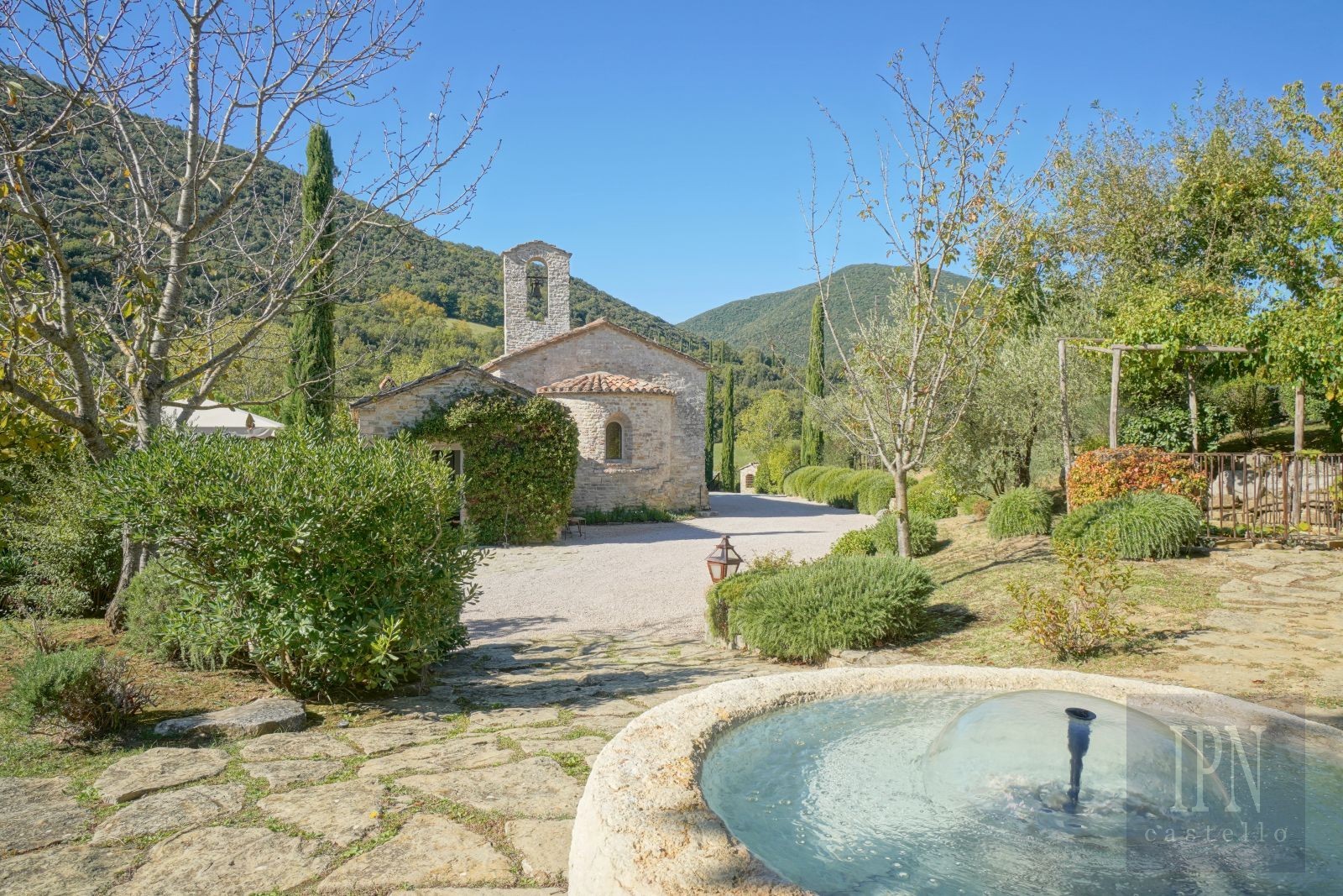 Fastigheten ligger i en lugn dal i Umbrien, omgiven av ängar, vingårdar, olivlundar och skogar, och kombinerar historisk arkitektur med modern komfort. Den omfattar en kyrka från 1200-talet som omvandlats till bostad samt en gård från 1700-talet, båda noggrant restaurerade enligt höga standarder.