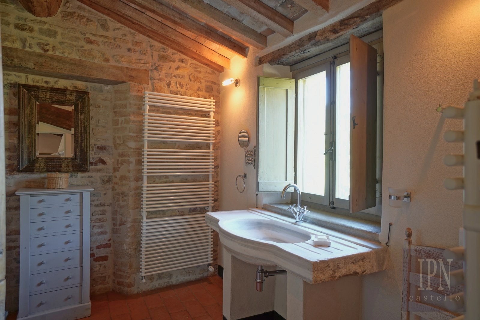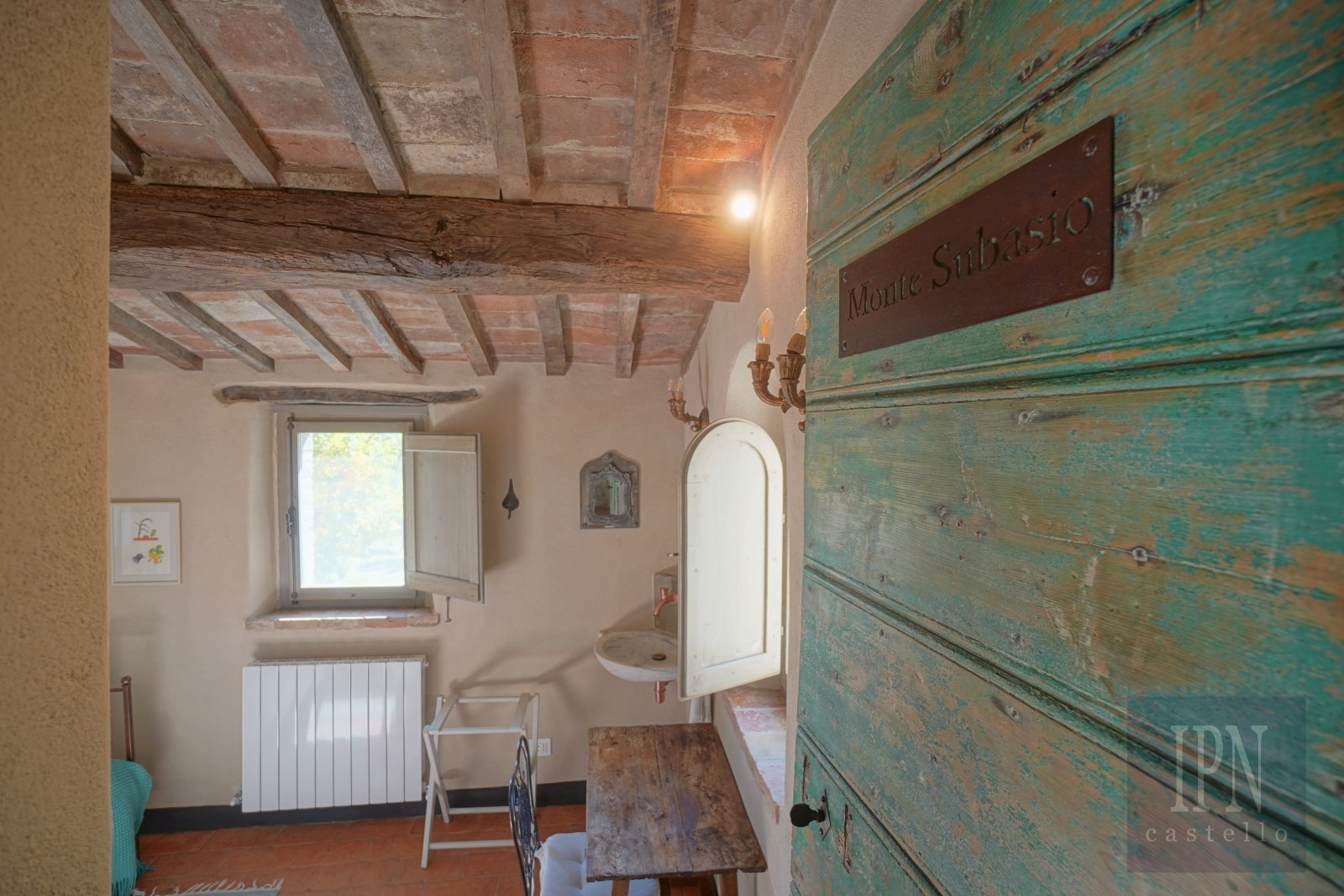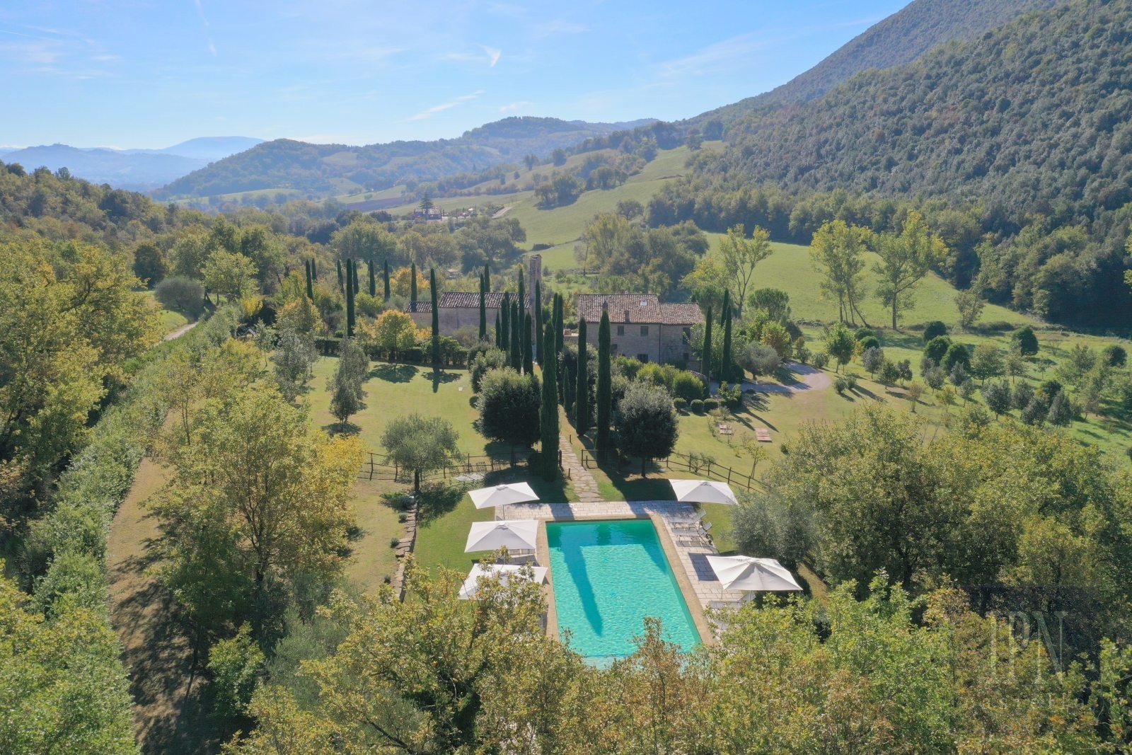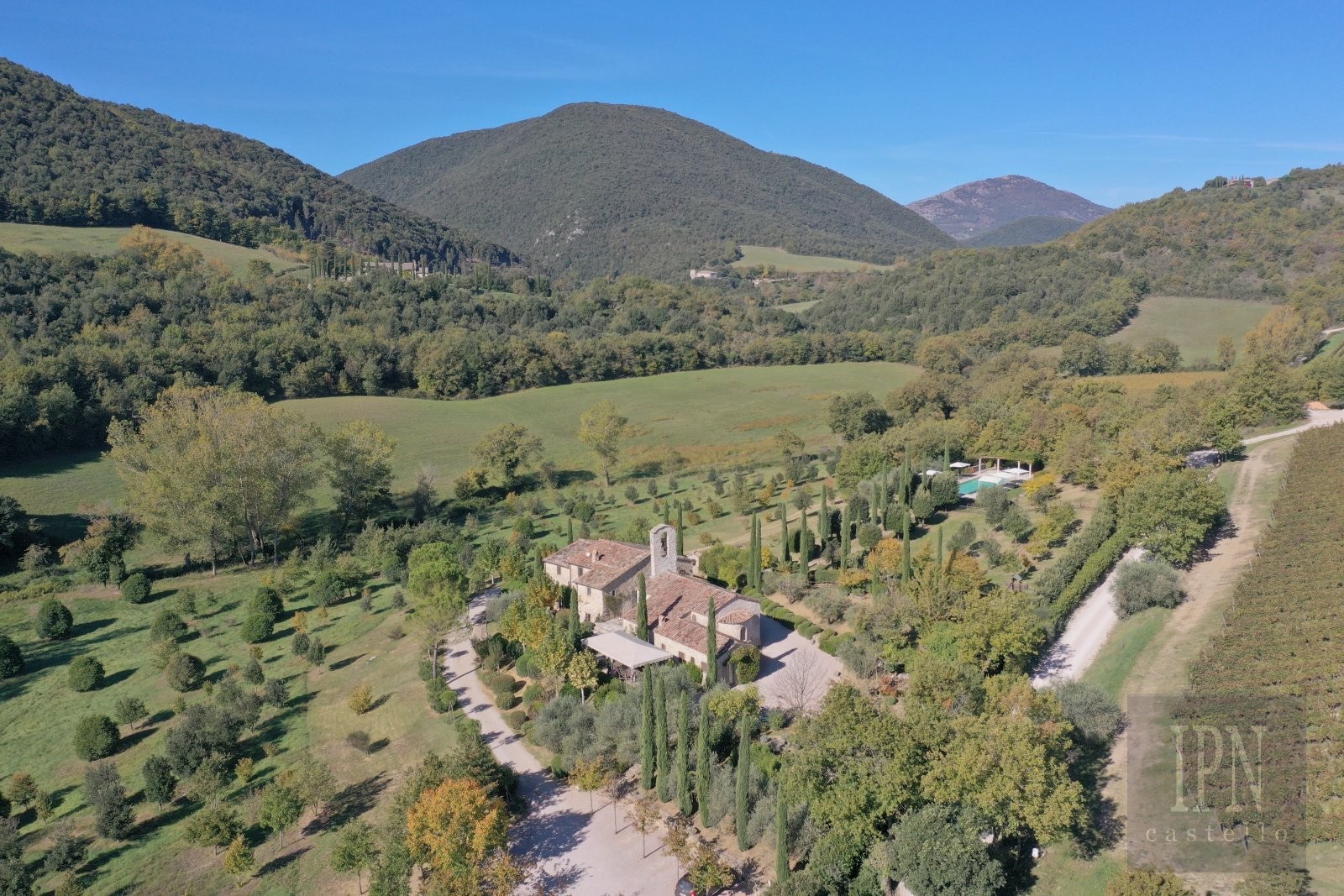 Fastigheten ligger i en lugn dal i Umbrien, omgiven av ängar, vingårdar, olivlundar och skogar, och kombinerar historisk arkitektur med modern komfort. Den omfattar en kyrka från 1200-talet som omvandlats till bostad samt en gård från 1700-talet, båda noggrant restaurerade enligt höga standarder.