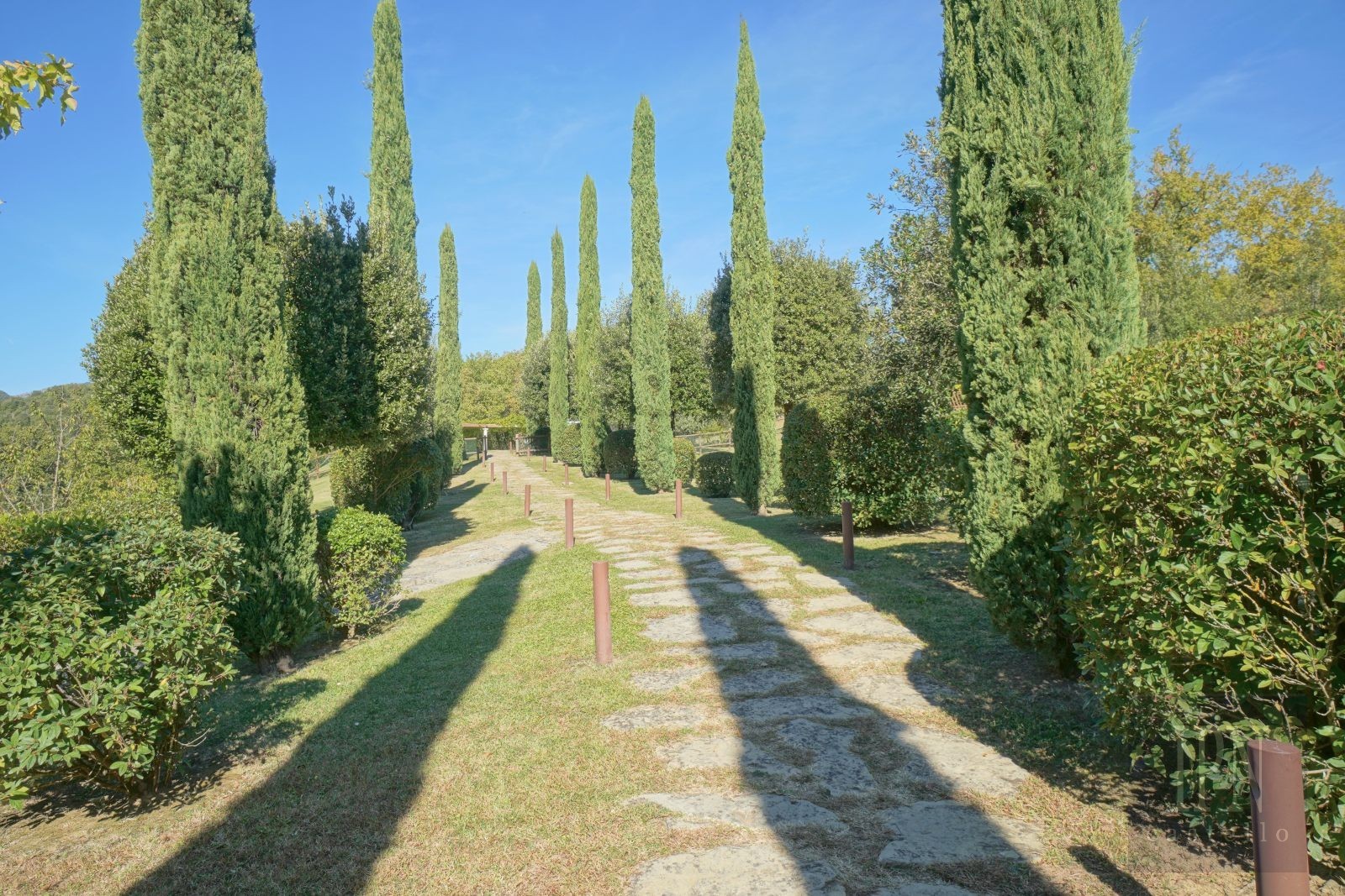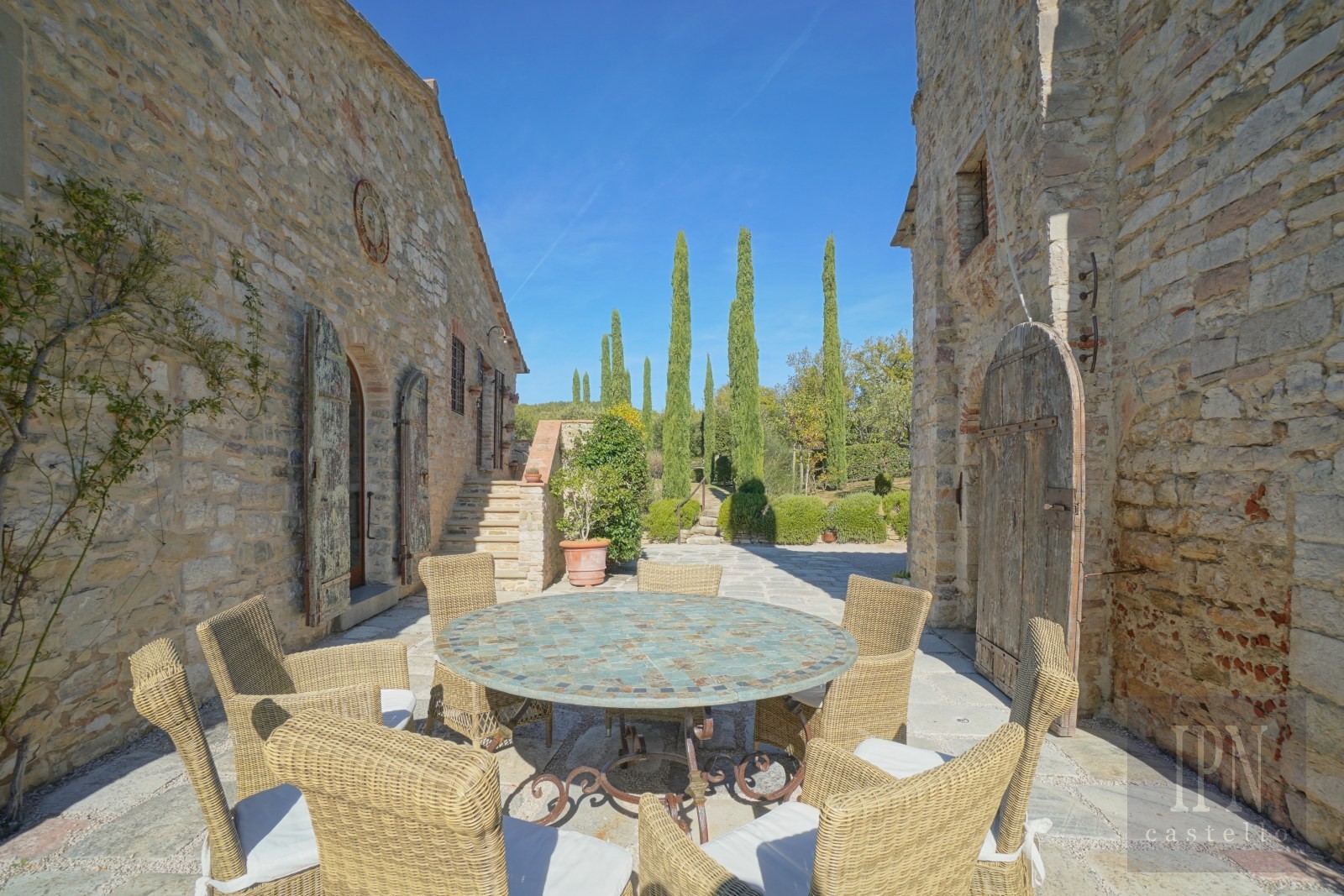 Utomhusytorna på 3,77 ha omfattar en tryffelskog på 2,7 ha, anlagda trädgårdar med lavendel, rosmarin och århundradsgamla olivträd, stenlagda terrasser och skuggade matplatser. En liten damm med fontän och en grönsaksodling kompletterar fastigheten. Poolen på 15 x 5,5 m är omgiven av gräsmattor och utrustad med poolhus, utomhusdusch och pergola.