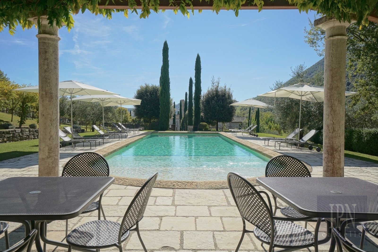 Fastigheten ligger vid foten av Monte Tezio och erbjuder panoramautsikt från Monte Subasio och Assisi till Antognolla slott och de skogklädda Apenninerna. Tillgång via privat väg, Antognolla Golf Club ligger tio minuters bilresa bort och Perugia 25 minuter.