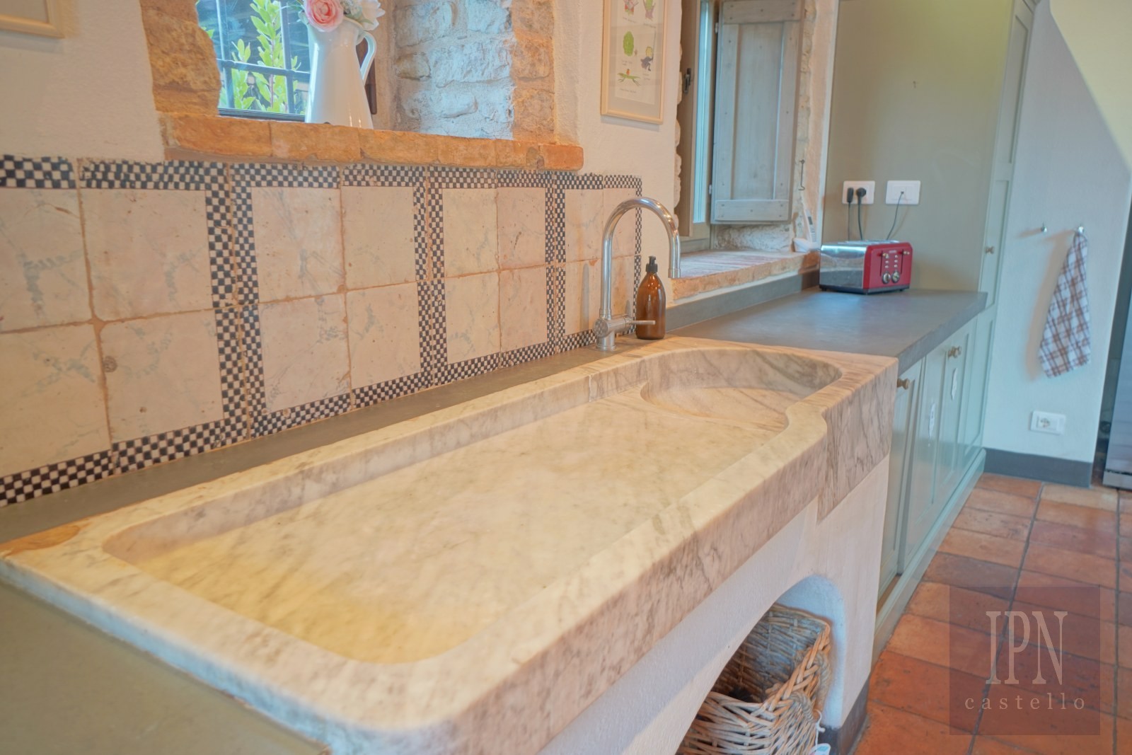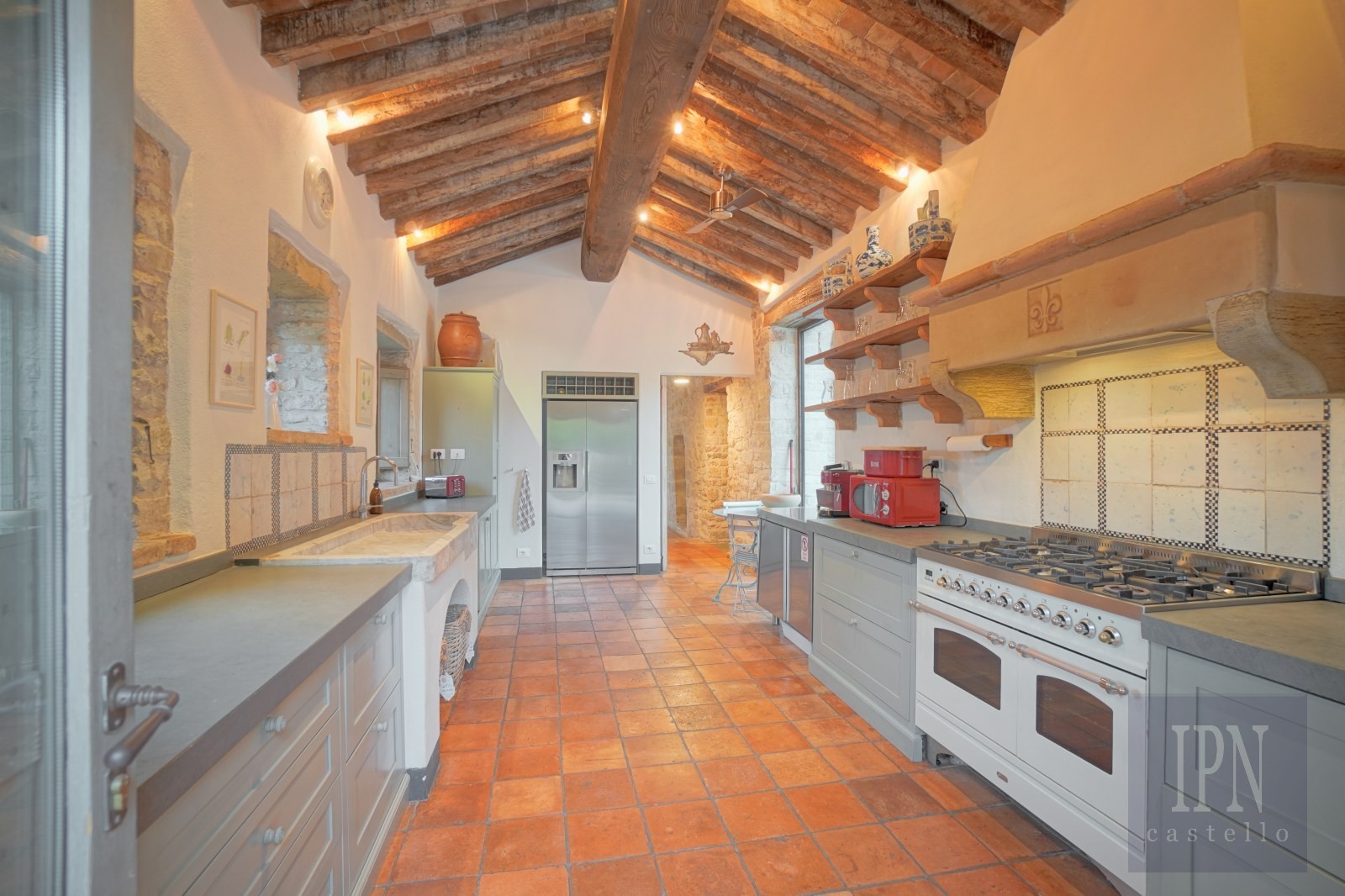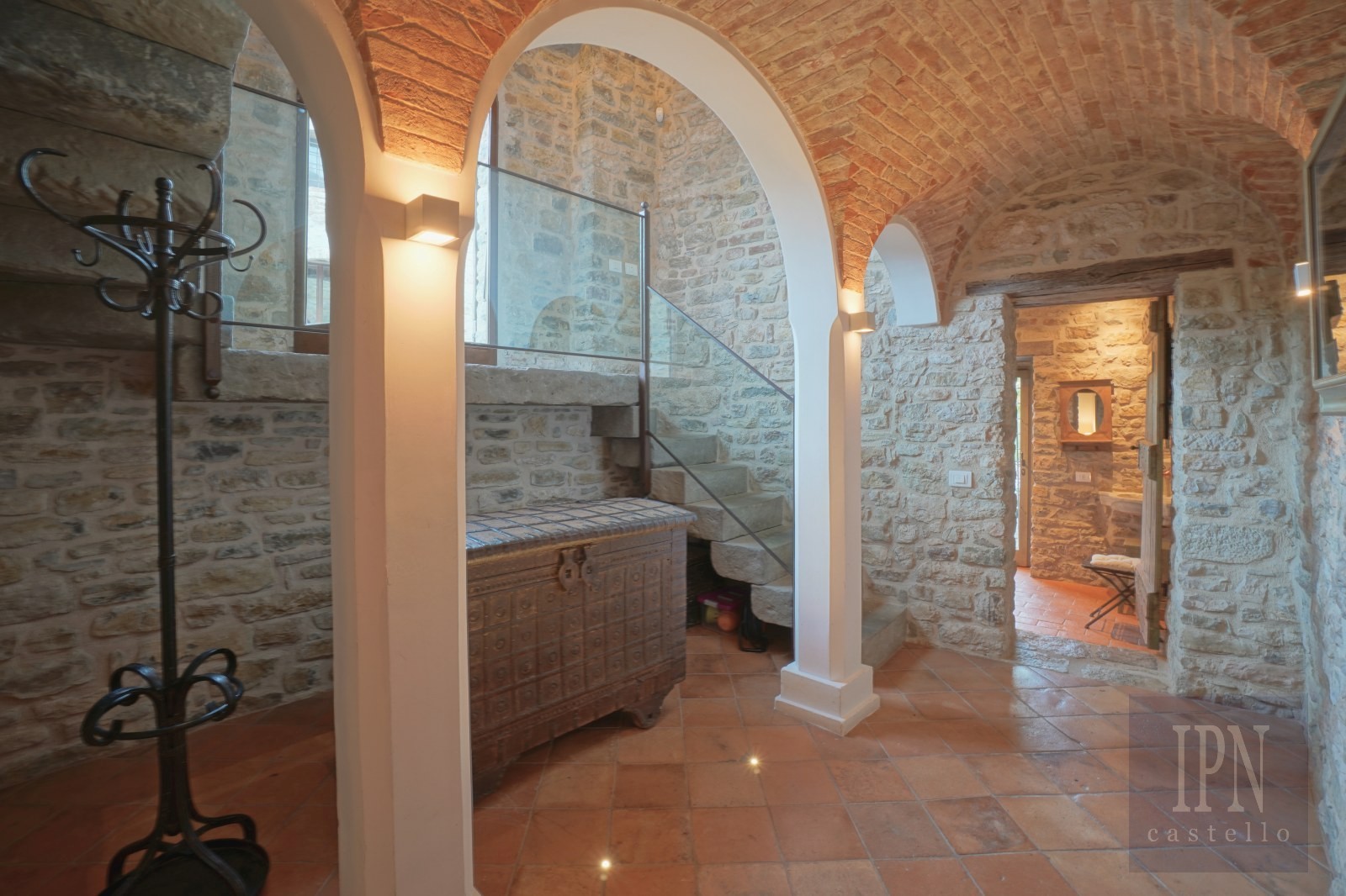Kyrkan på 134 m² utgör fastighetens centrum och erbjuder fullt utrustat kök, matsal och rymligt vardagsrum. Originalarkitektoniska element, inklusive en liten krypta, har bevarats. Stora fönster ger panoramautsikt över det umbrianska landskapet och skapar en lugn miljö som passar för avkoppling och mottagande av gäster.