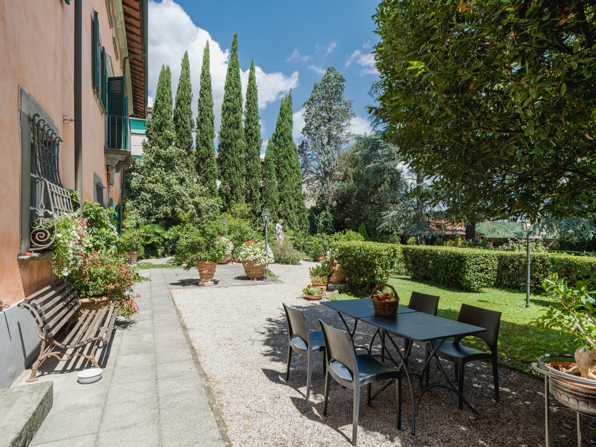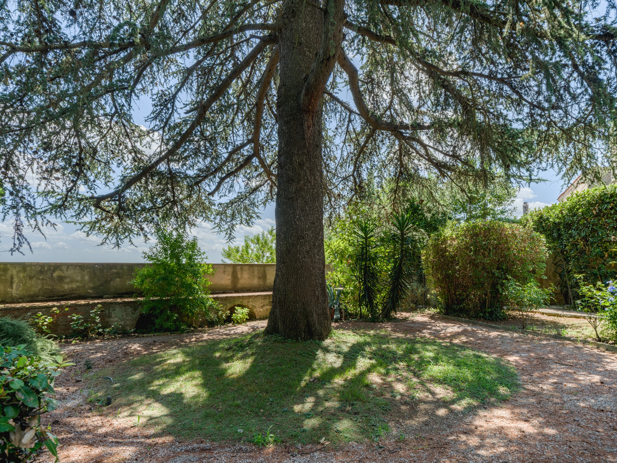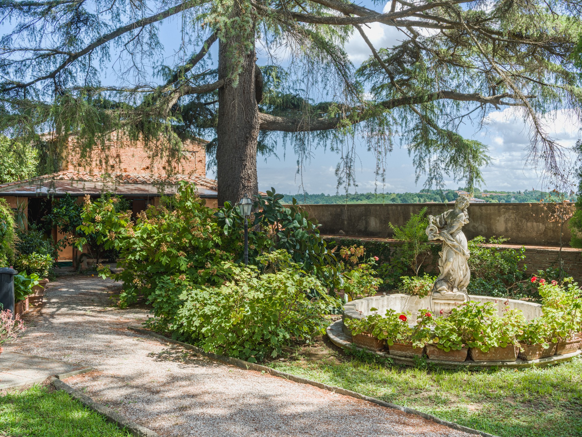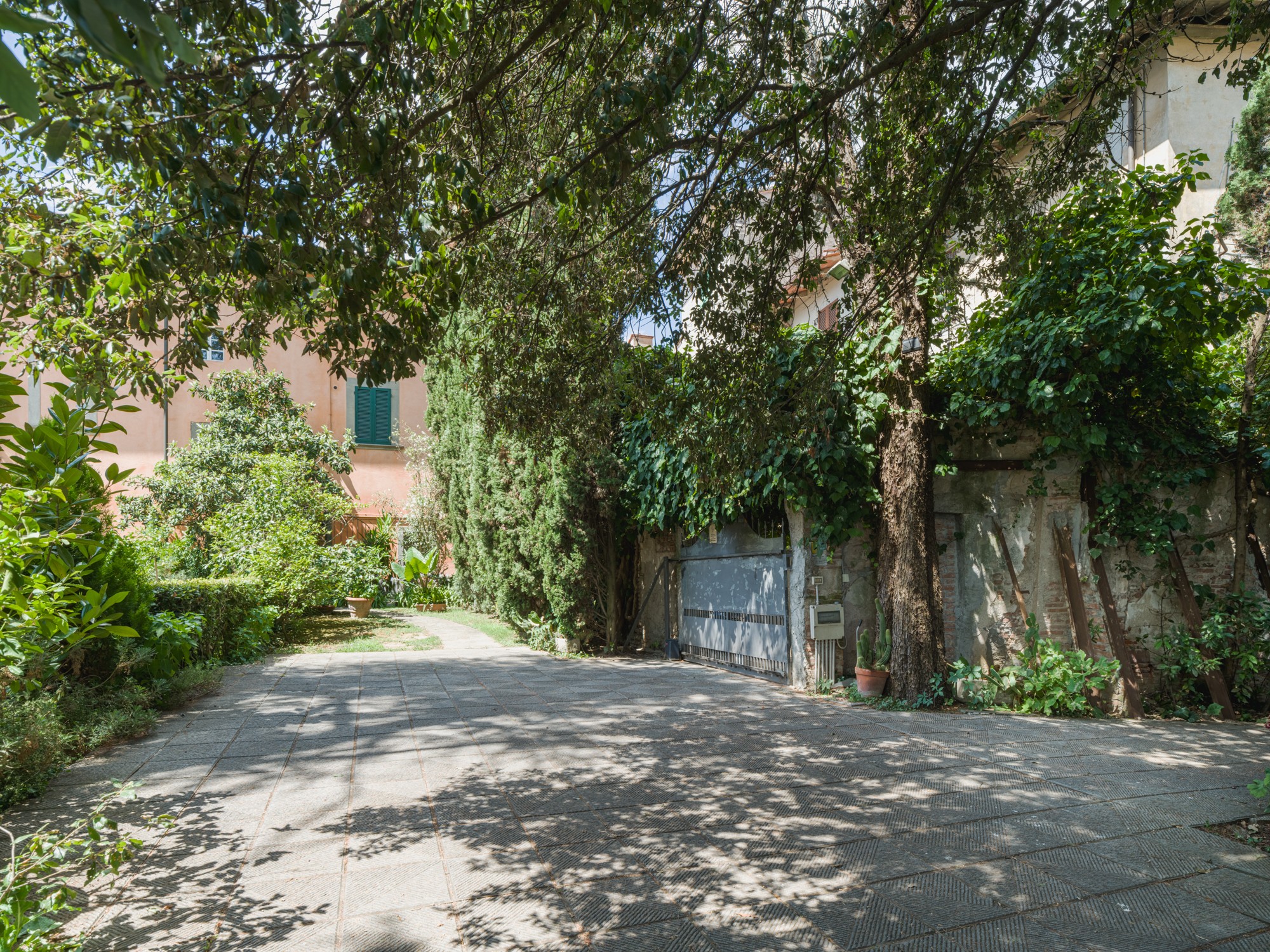Den parkliknande tomten med äldre träd erbjuder en vidsträckt utsikt över det toskanska landskapet. En formell italiensk trädgård angränsar till byggnaden. Tillstånd för byggnation av pool (15 × 8 m, djup 1,6 m) finns. Ytterligare ytor finns tillgängliga för trädgårdsbruk eller rekreation.