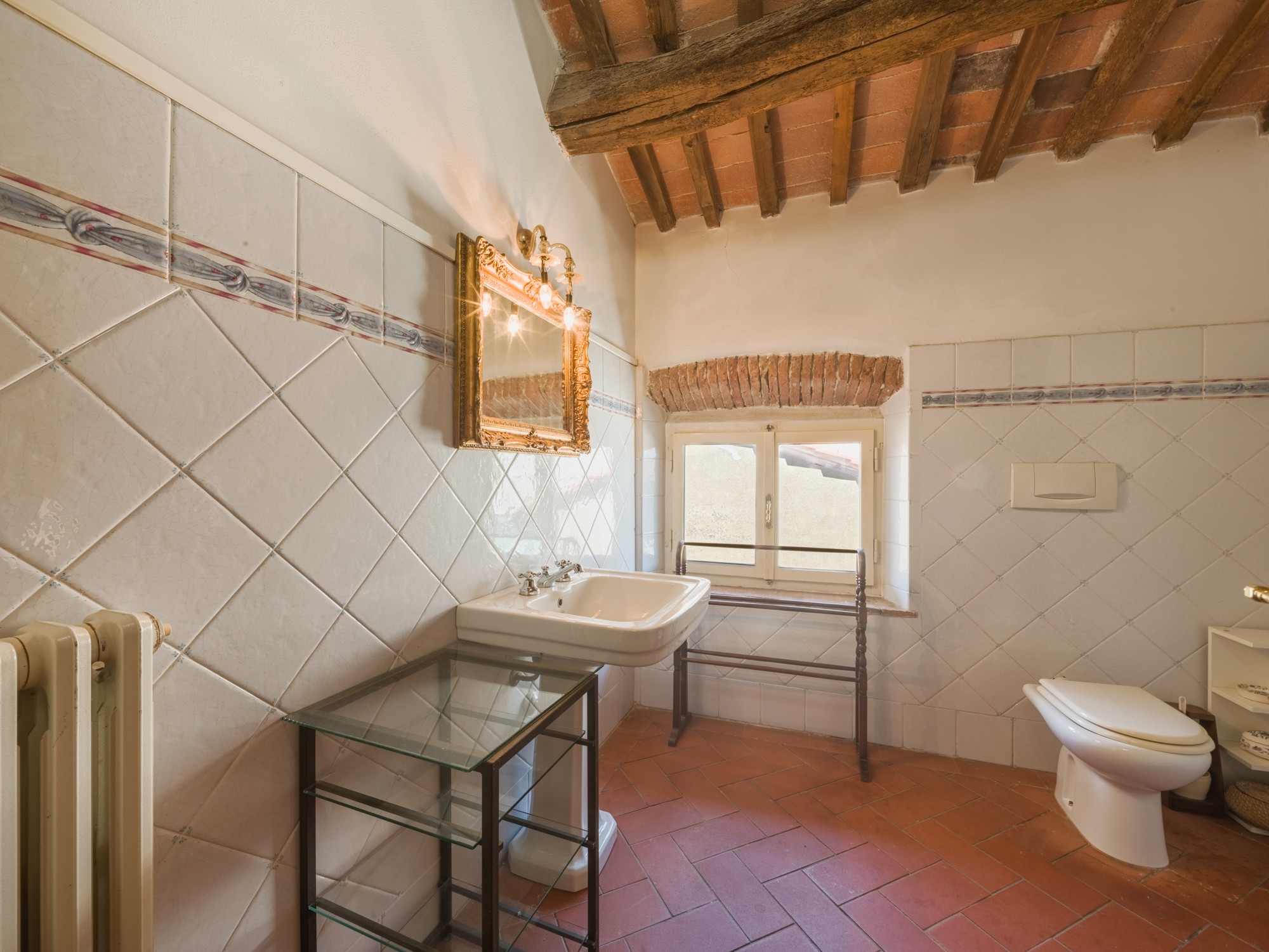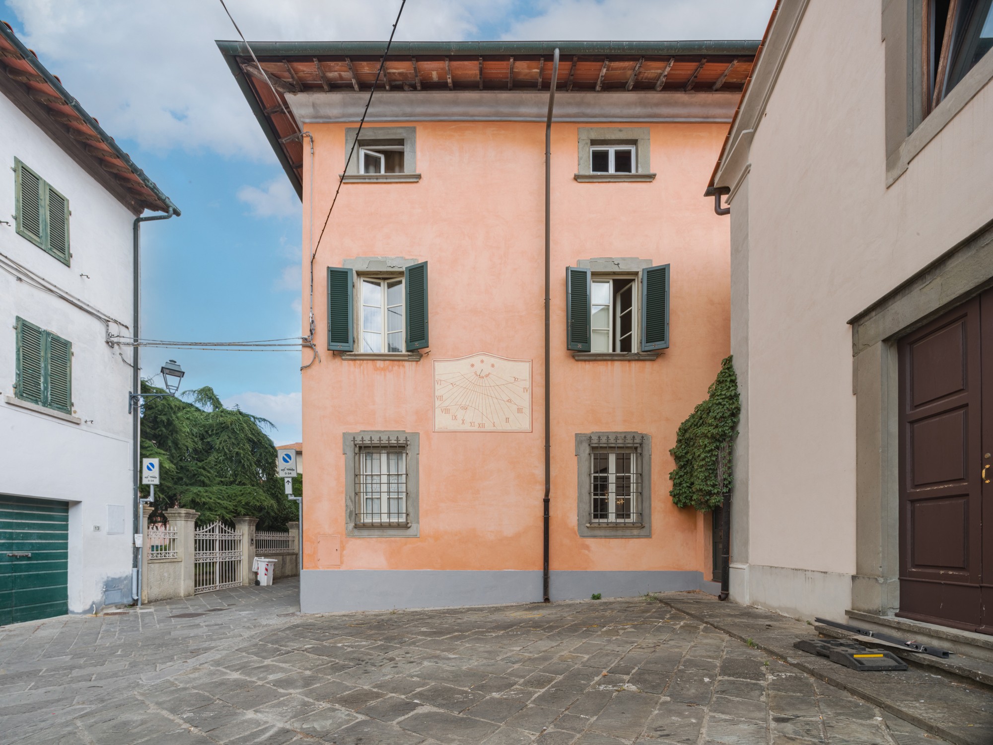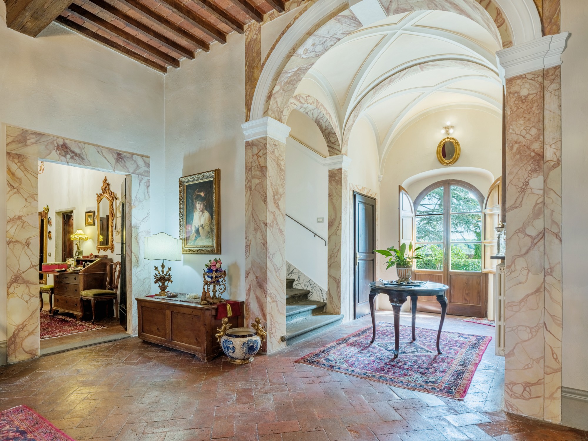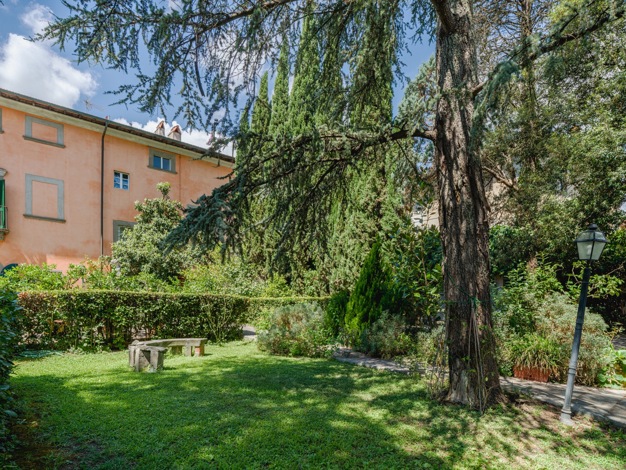 Den parkliknande tomten med äldre träd erbjuder en vidsträckt utsikt över det toskanska landskapet. En formell italiensk trädgård angränsar till byggnaden. Tillstånd för byggnation av pool (15 × 8 m, djup 1,6 m) finns. Ytterligare ytor finns tillgängliga för trädgårdsbruk eller rekreation.